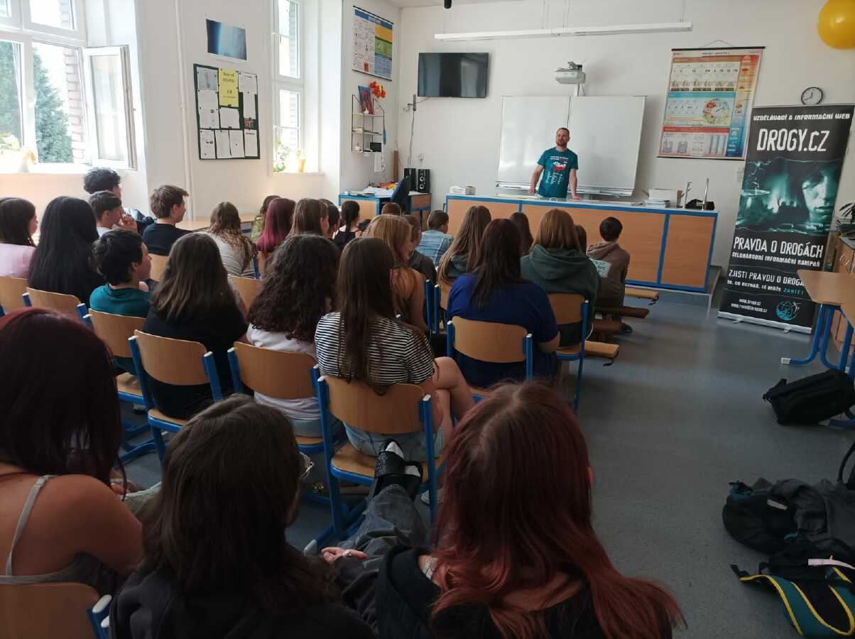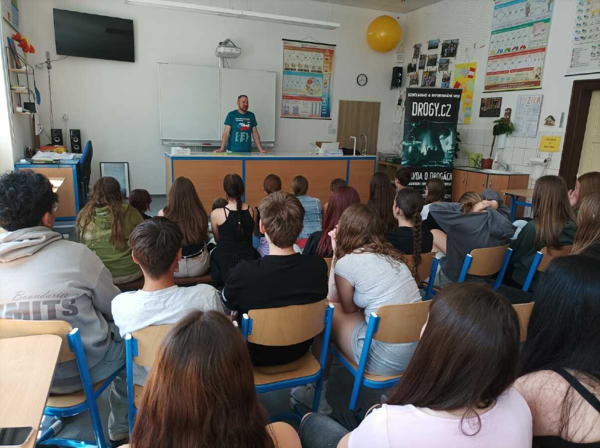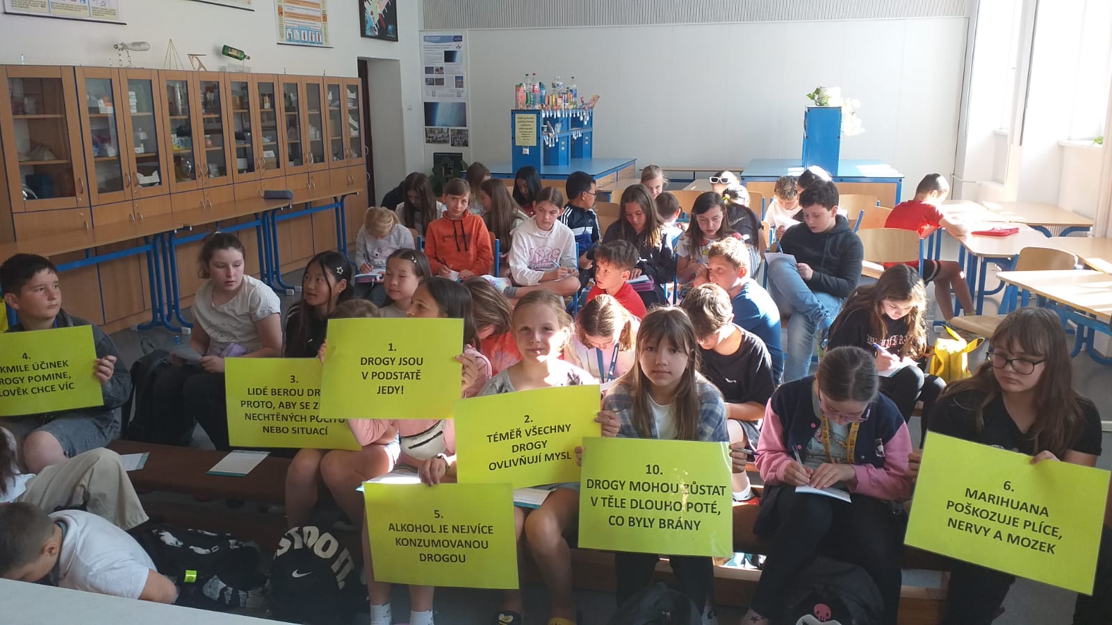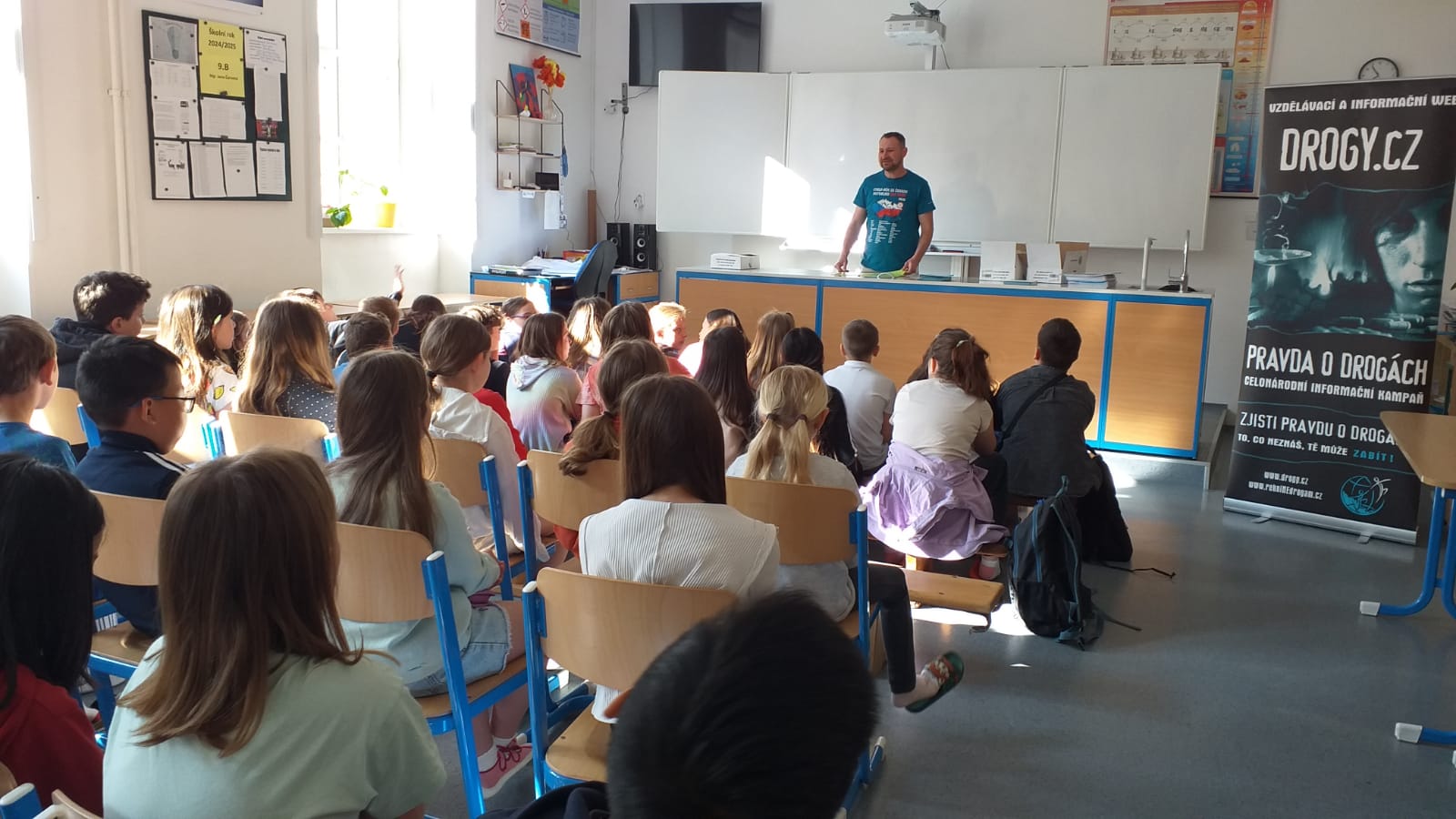 Žáci 4. - 8.ročníků se v pátek 13.6. účastnili přednášky o drogách. Seznámili se s tím, co jsou drogy. Drogy = jed. Člověk bere drogy, aby se zbavil nechtěných pocitů. Dlouhodobé užívání bohužel tyto pocity velmi prohlubuje.