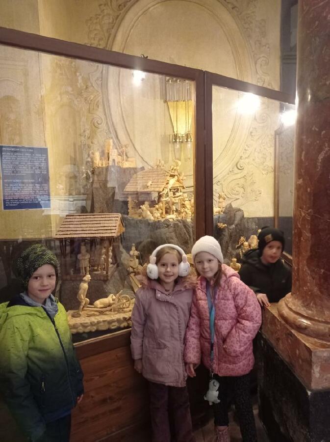 V pátek 12. 12. 2025 navštívili žáci 3. oddělení školní družiny vánoční výstavu. V krásném barokním prostoru kostela sv. Jana Nepomuckého jsou vystaveny jedinečné řezby a akvarely výtvarnice Hany Richterové doplněné textilním uměním skupiny Zašitá krása. K vidění jsou originální patchworkové obrazy na téma Pražské Jezulátko. V kostele se nachází i dřevěný betlém Josefa Duška vyřezávaný z lipového dřeva.
