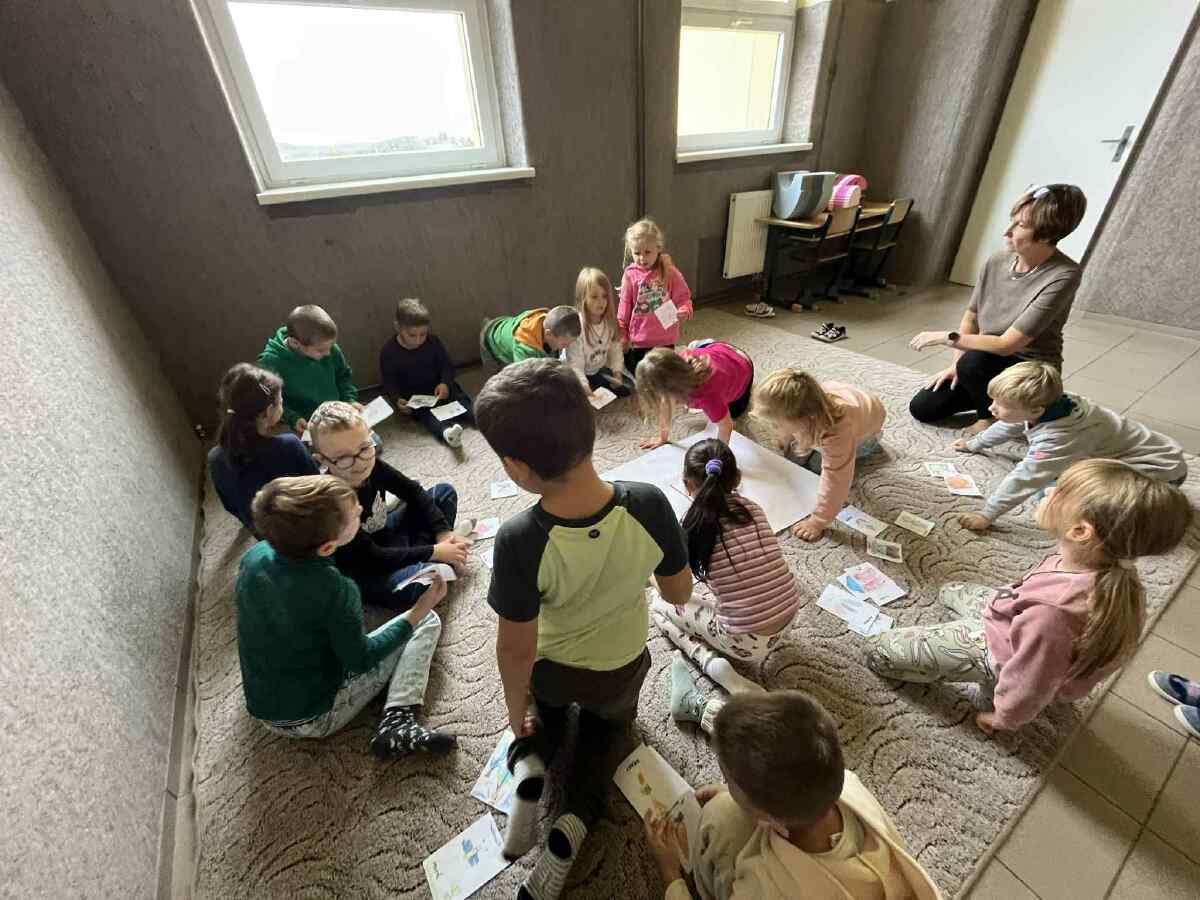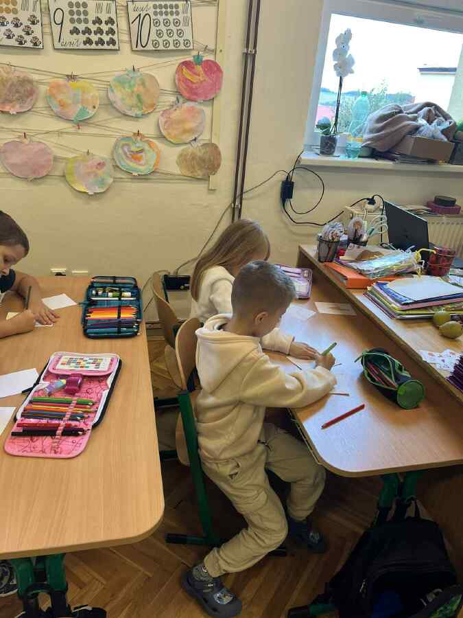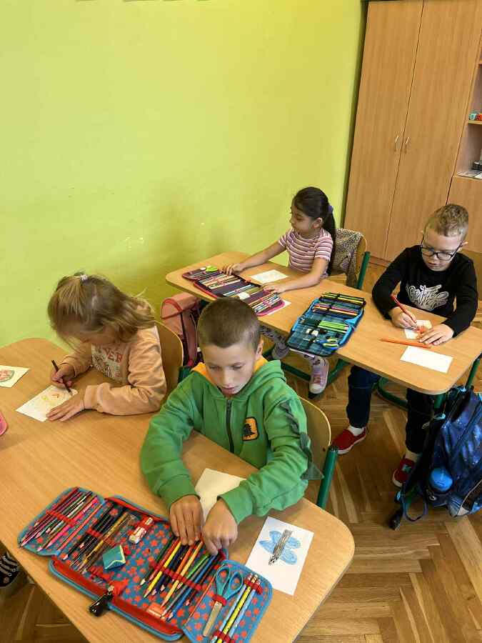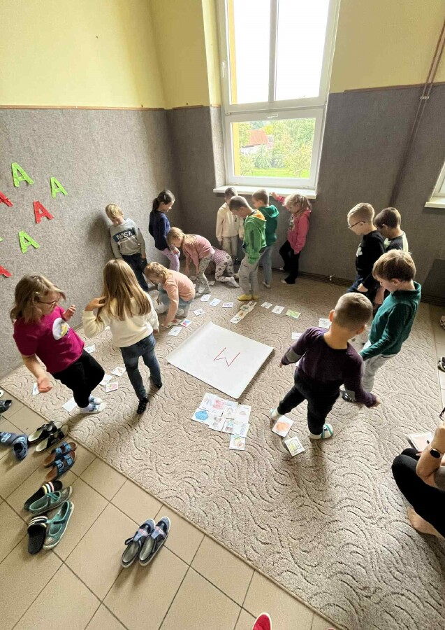 Prvňáci si vyzkoušeli první velkou skupinovou práci. Děti měly nejprve při výtvarné výchově za úkol kreslit obrázky, které vyjadřují slova začínající písmenem M. Ve skupinách pak jednotlivé obrázky pojmenovávaly a třídily do skupin. Výsledkem je Pojmová mapa se čtyřmi rameny - lidé, jídlo, věci a zvířata.