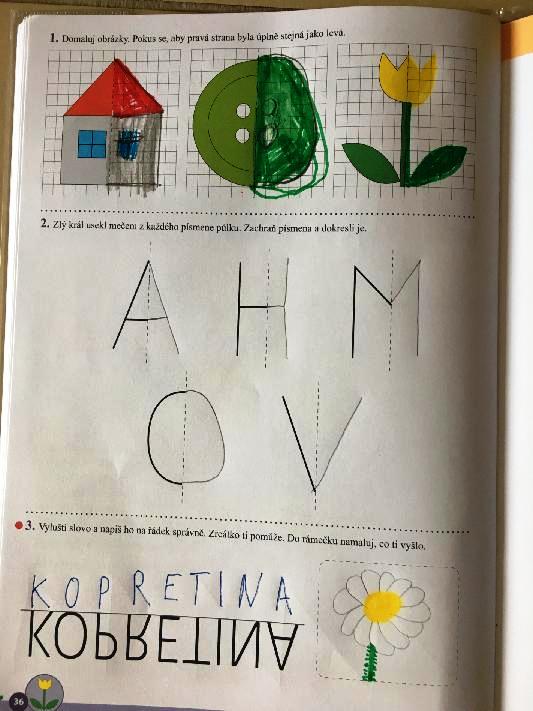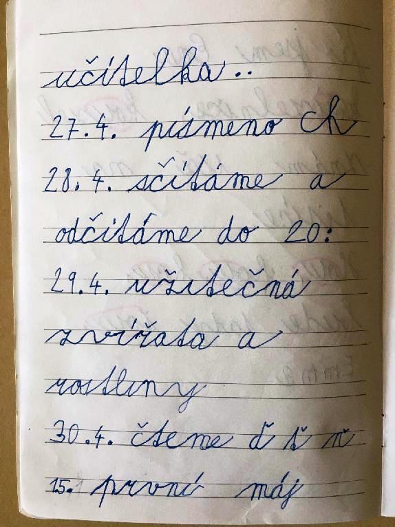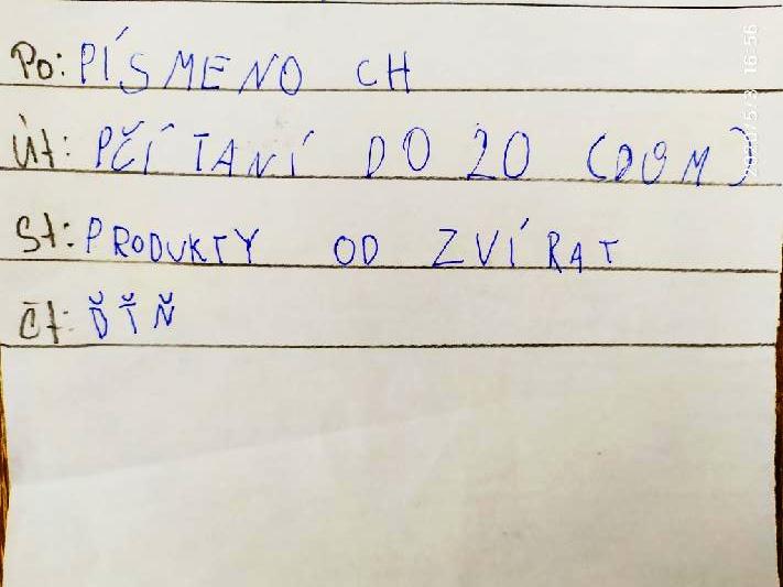 Dobrý den,posíláme úkoly..v pořadu Učítelka bylo v pondělí písmeno CH,úterý počítání 0 až 20,středa člověk a jeho svět a čtvrtek písmena ď,ť,ň.