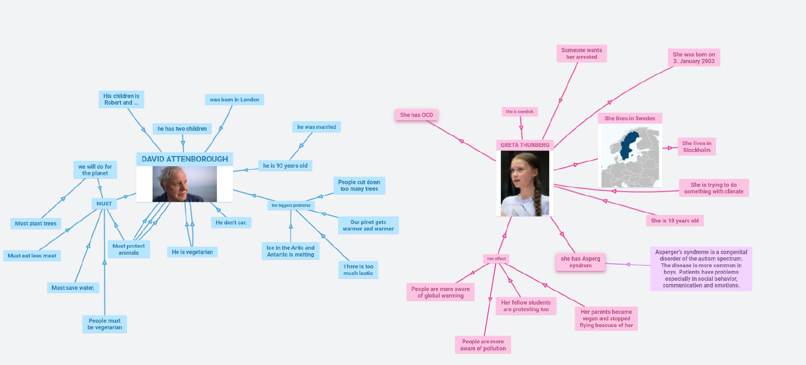 dvě známé osobnosti boje za čistou planetu. Všichni si zkusili práci překladatele a nyní přináší základní informace o Davidovi Attenborough a Grétě Thunberg ve svém projektu. Tyto informace poté shrnuli ve společné mapě - jak jinak než opět v anglickém jazyce.