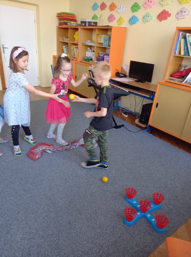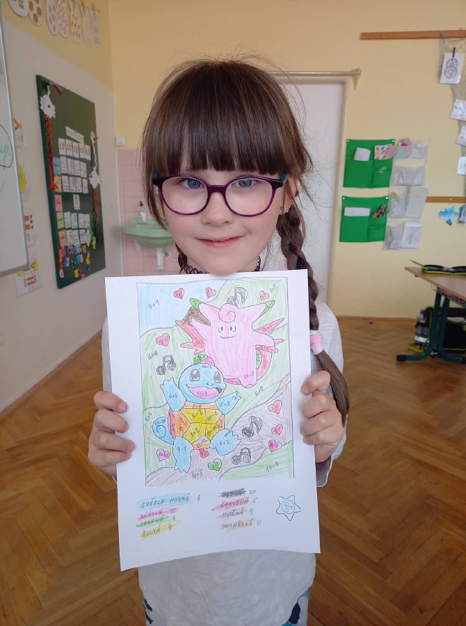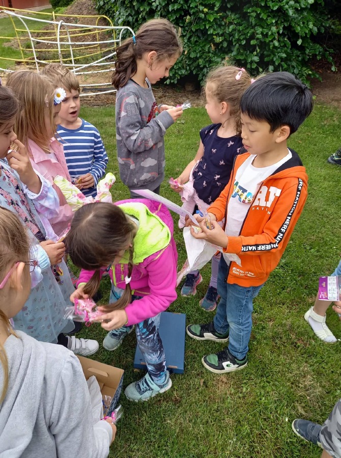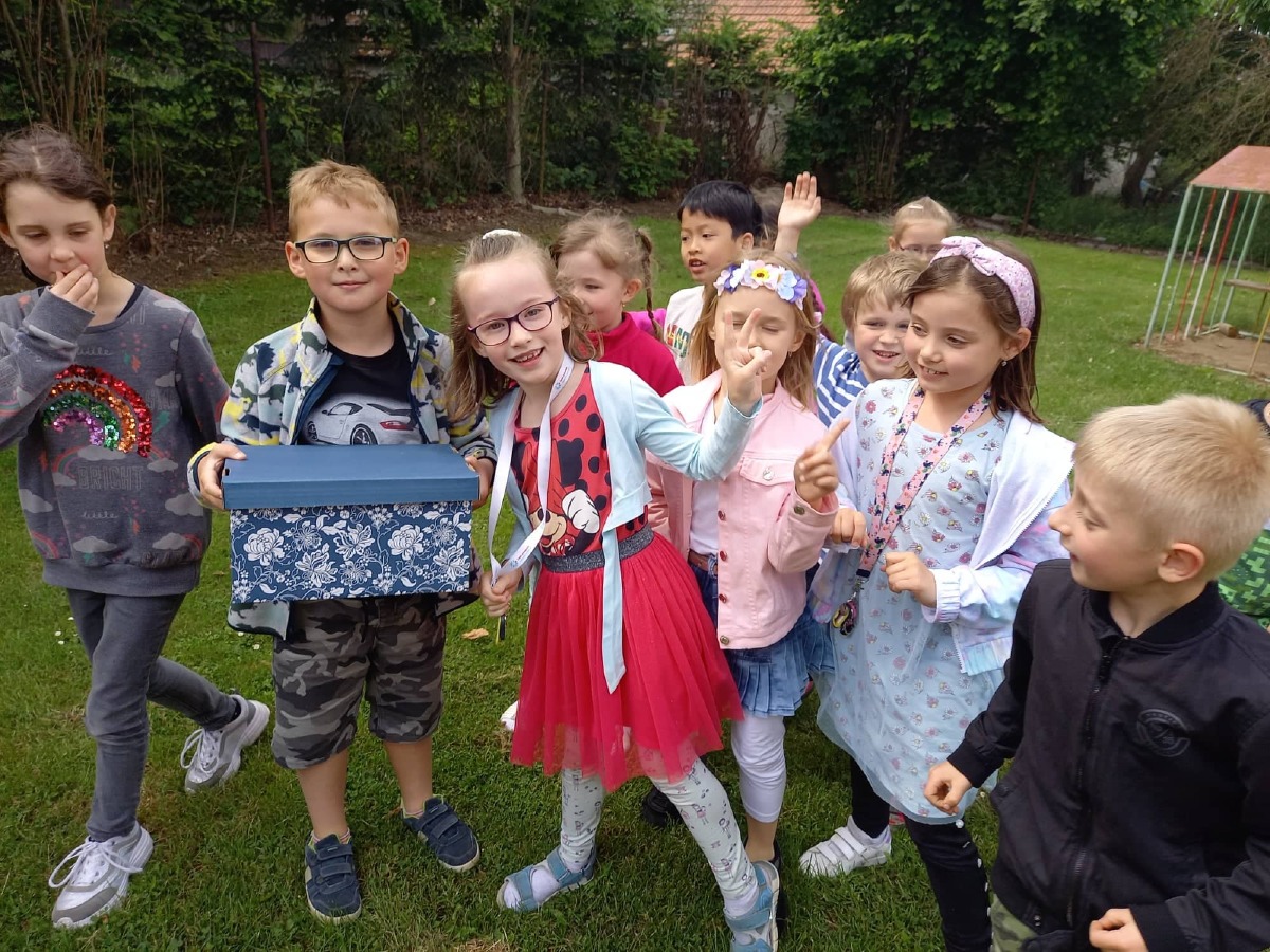 Děti z 1.A měly za úkol splnit řadu rozmanitých aktivit. Četli jsme a počítali, modelovali, soutěžili v házení, tančili i zpívali, psali jsme si na záda a luštili šifry. Po splnění všech úkolů dostaly děti nápovědu k tomu, kde je schovaná odměna a dárek od paní učitelky...![]()