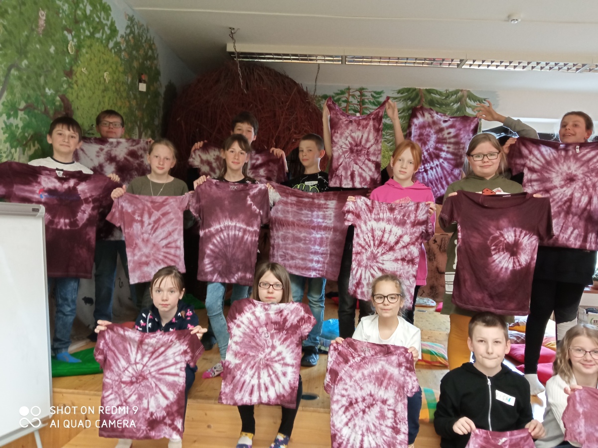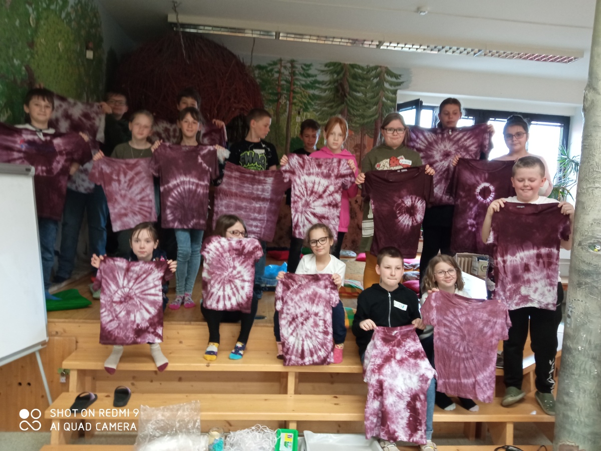 A na závěr jsme batikovali trička - na fotografii snadno poznáte,