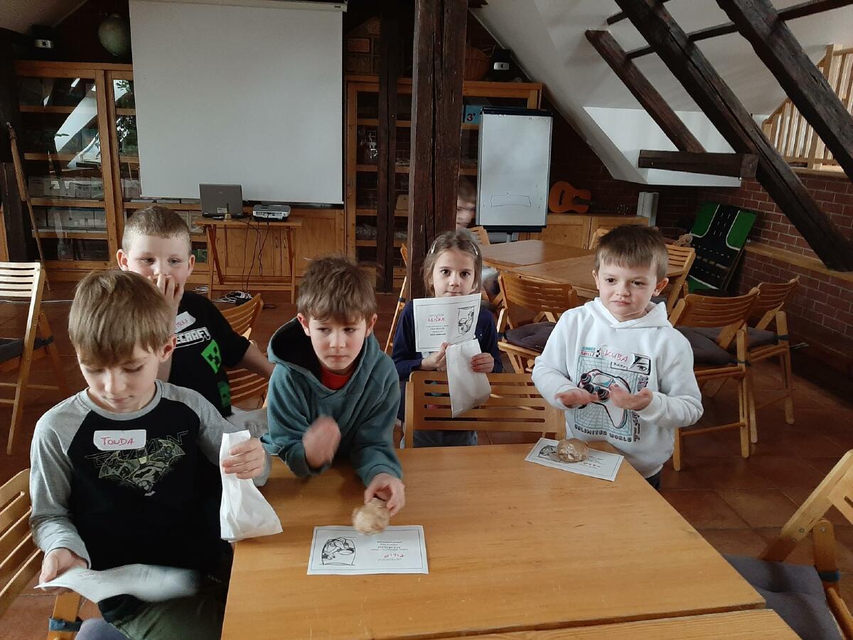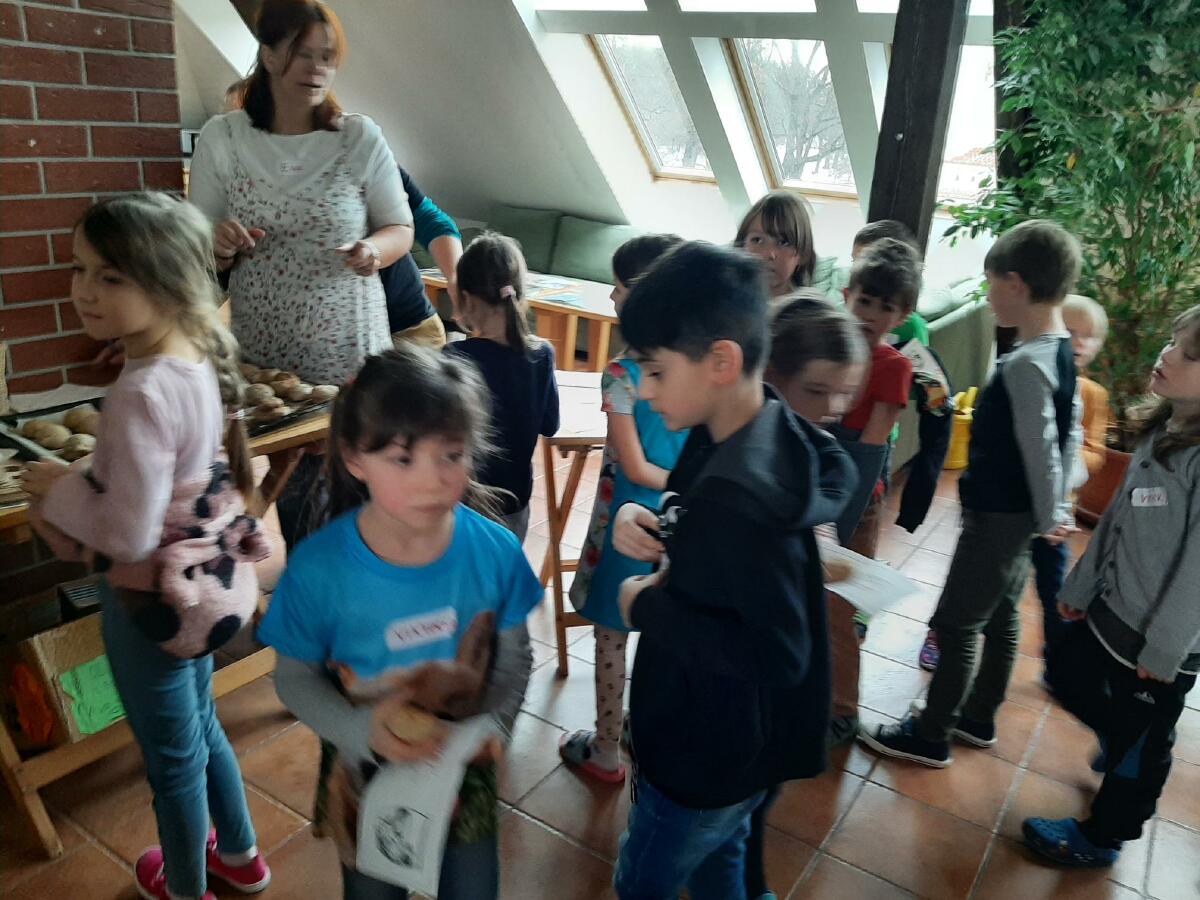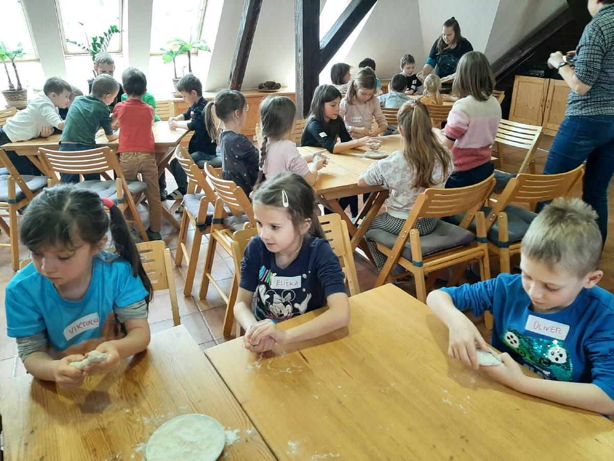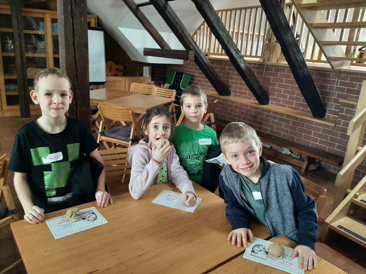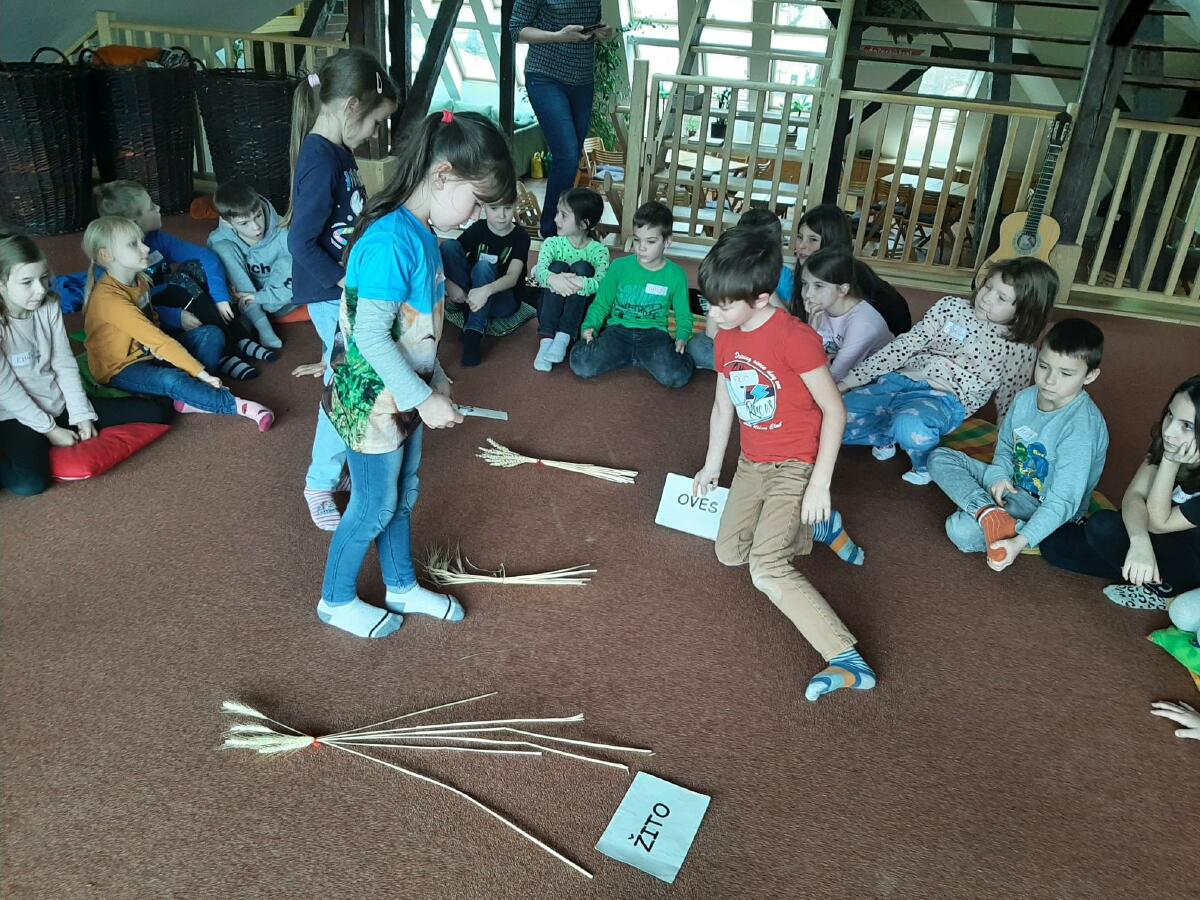 Během 120 min se děti seznámily s dlouhou cestou malého zrníčka až po chleba na náš stůl. Žáci se naučili rozlišovat základní 4 druhy obilí, vyzkoušeli si zadělat těsto, také mlátili obilí cepem. Domů si pak děti vezly recept na chleba a čerstvě upečené malé chlebové bochánky. Celou návštěvu v Ekocentru jsme zakončili nákupem suvenýrků v místním obchůdku.