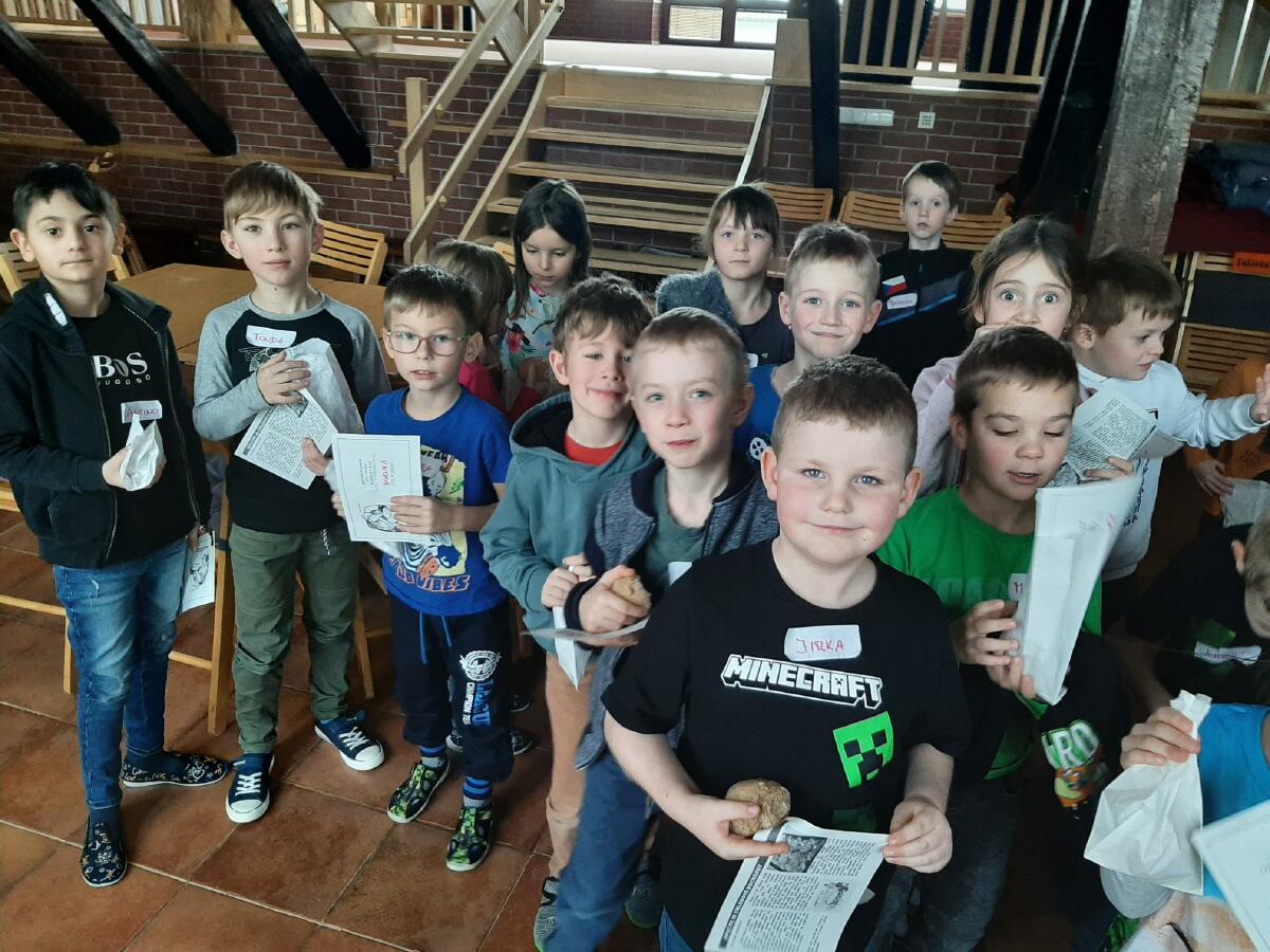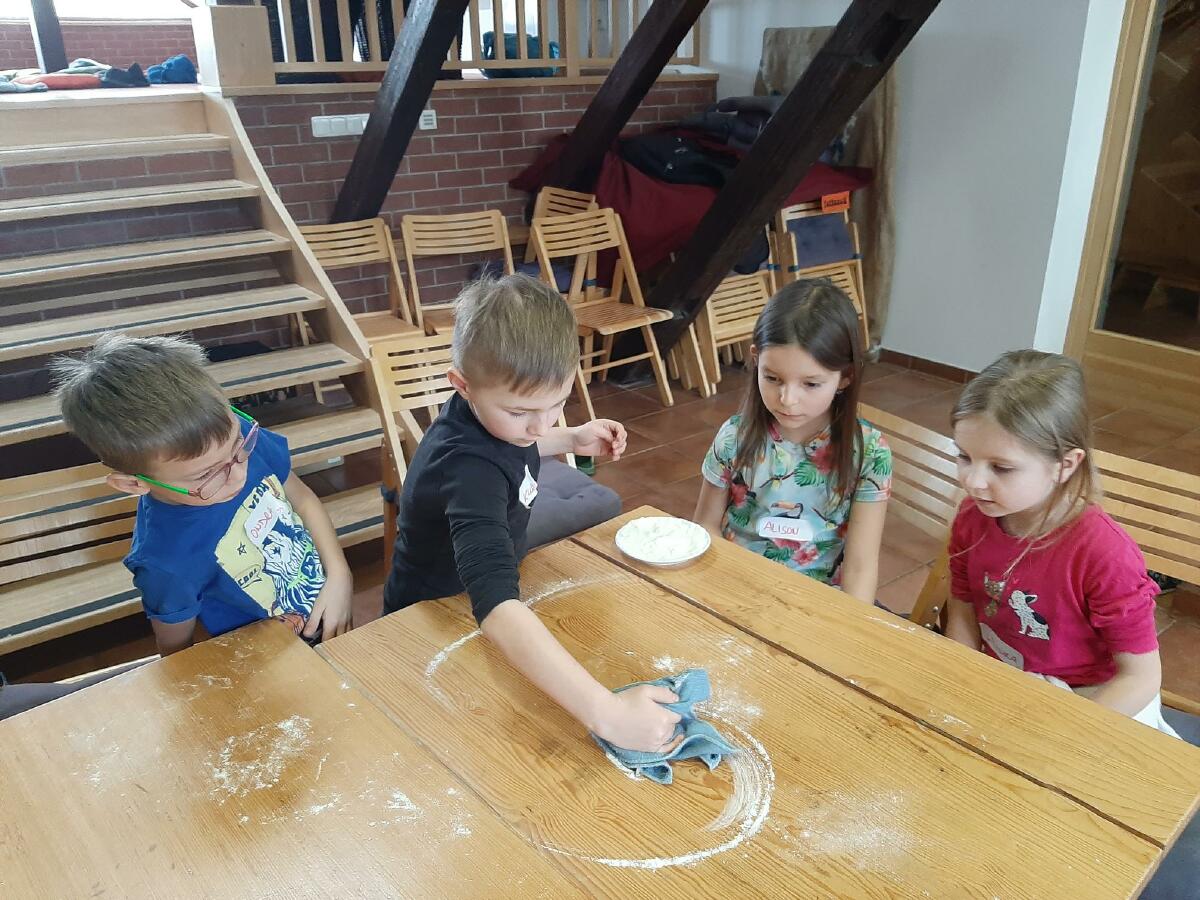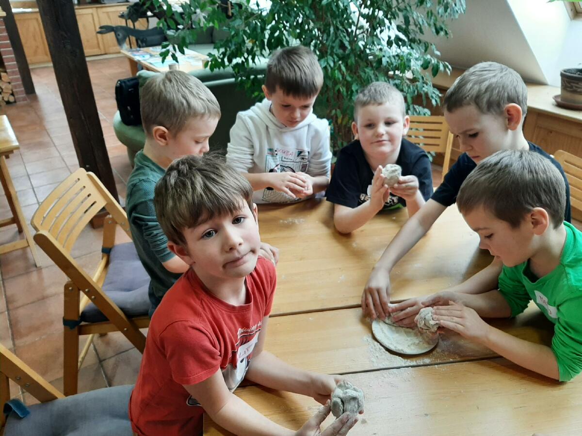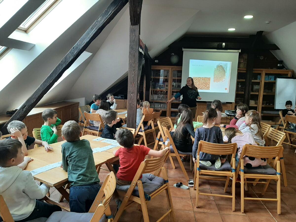 Během 120 min se děti seznámily s dlouhou cestou malého zrníčka až po chleba na náš stůl. Žáci se naučili rozlišovat základní 4 druhy obilí, vyzkoušeli si zadělat těsto, také mlátili obilí cepem. Domů si pak děti vezly recept na chleba a čerstvě upečené malé chlebové bochánky. Celou návštěvu v Ekocentru jsme zakončili nákupem suvenýrků v místním obchůdku.