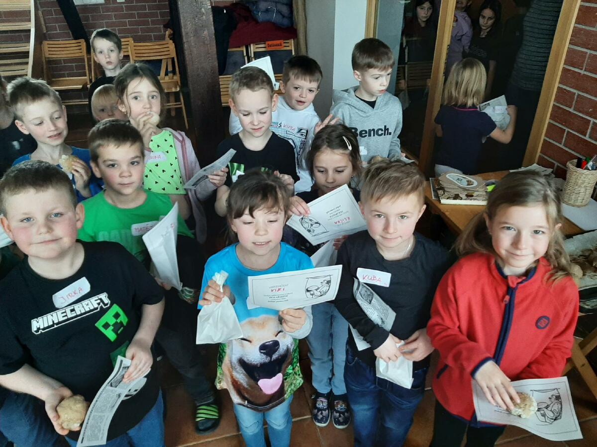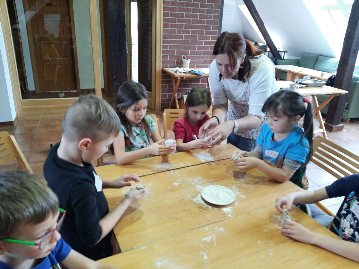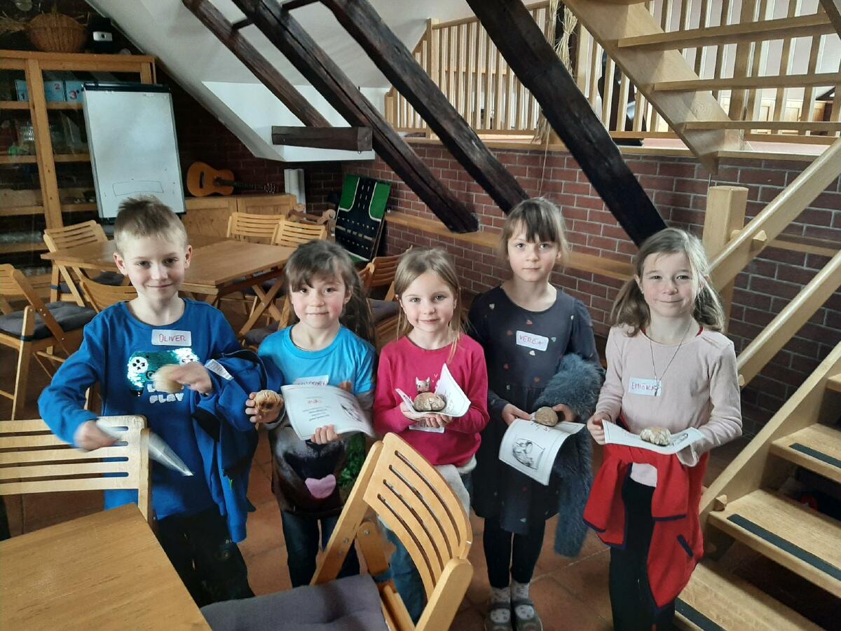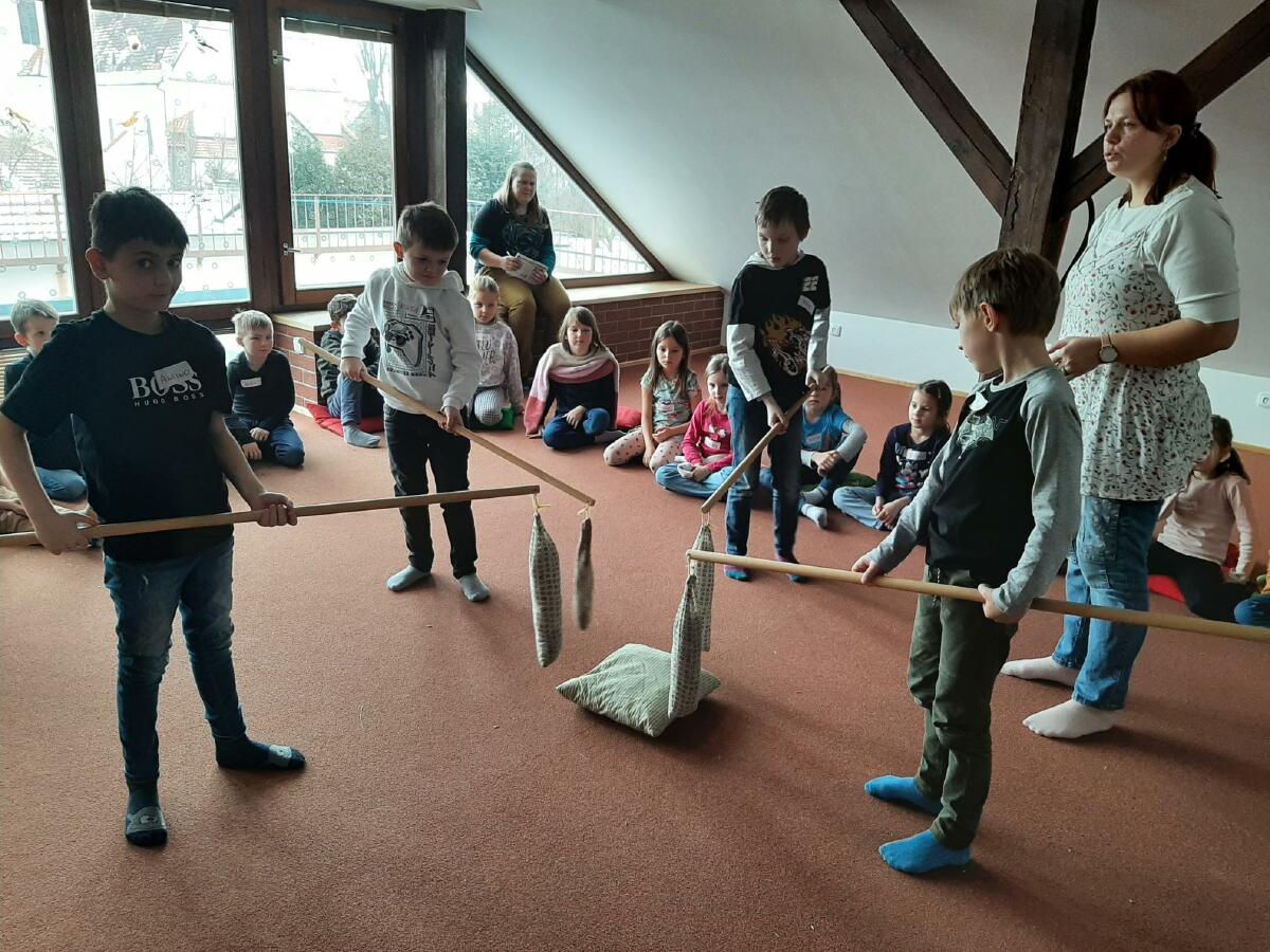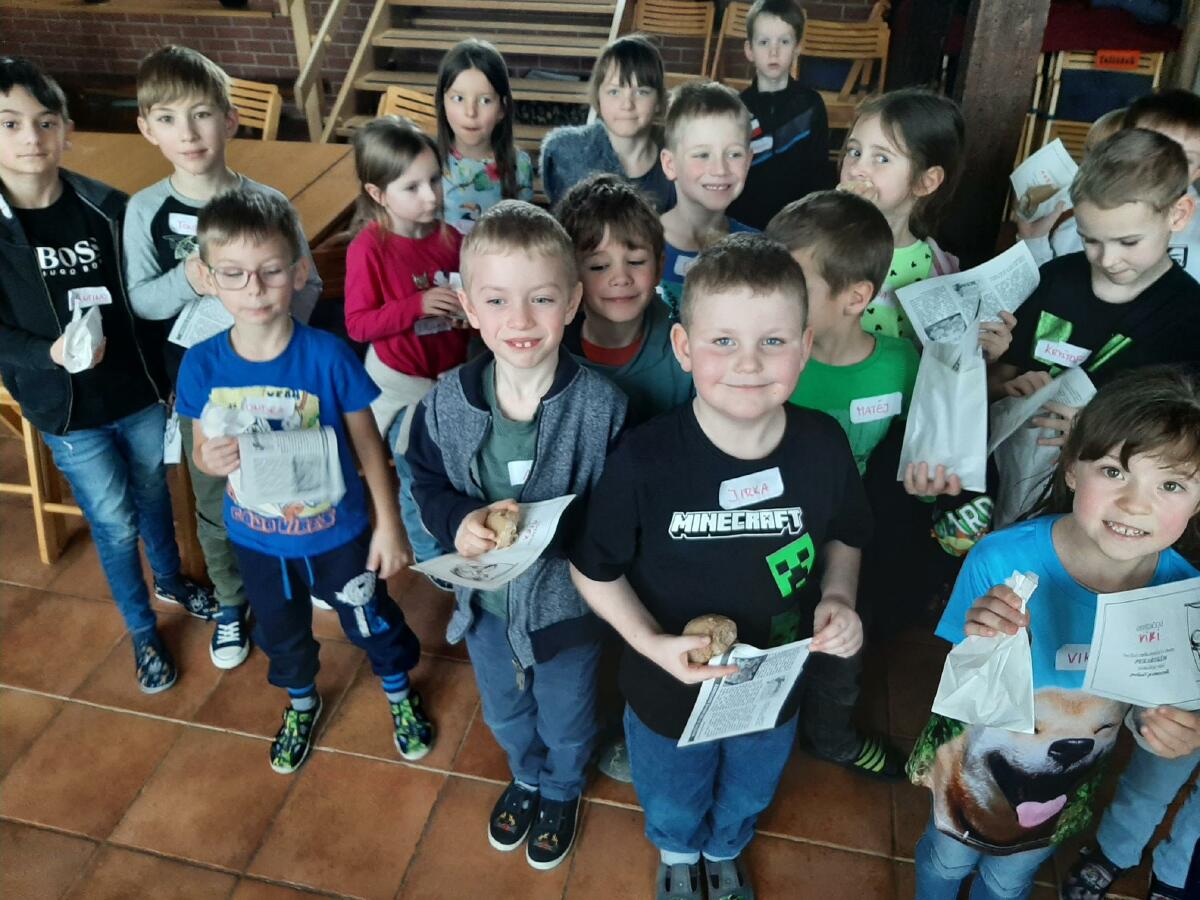 Během 120 min se děti seznámily s dlouhou cestou malého zrníčka až po chleba na náš stůl. Žáci se naučili rozlišovat základní 4 druhy obilí, vyzkoušeli si zadělat těsto, také mlátili obilí cepem. Domů si pak děti vezly recept na chleba a čerstvě upečené malé chlebové bochánky. Celou návštěvu v Ekocentru jsme zakončili nákupem suvenýrků v místním obchůdku.