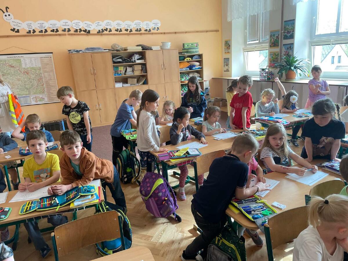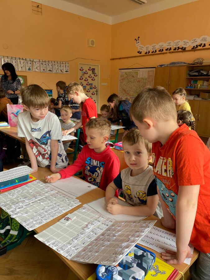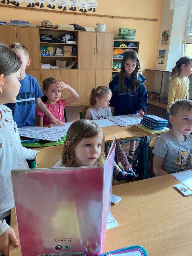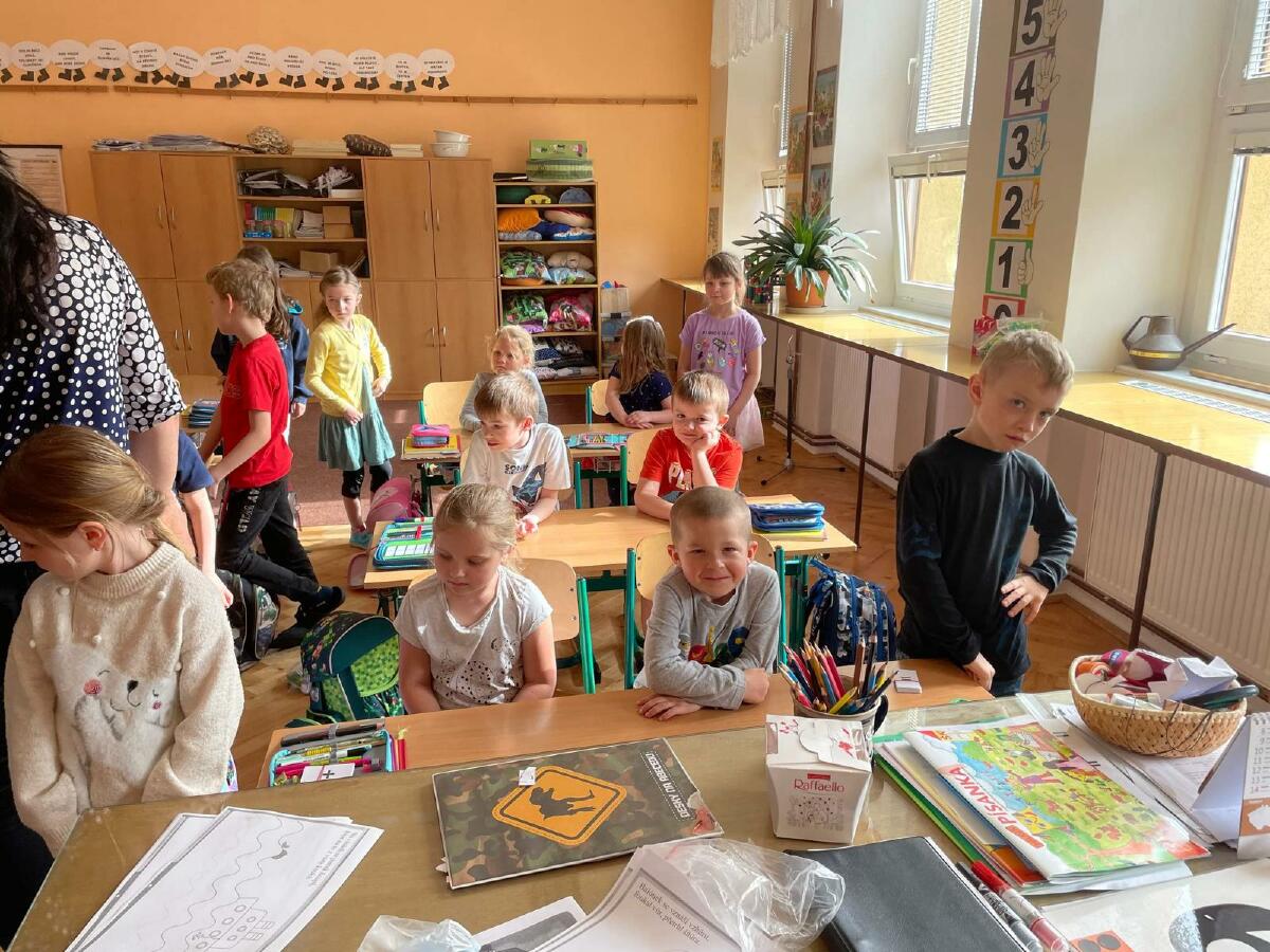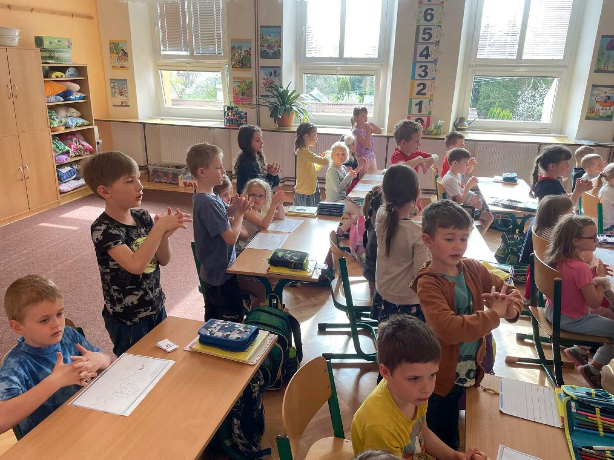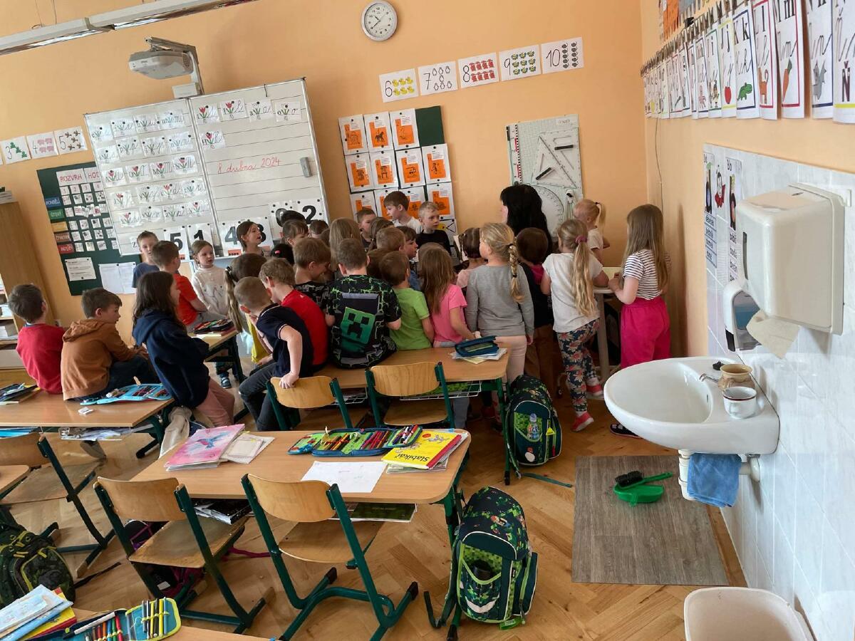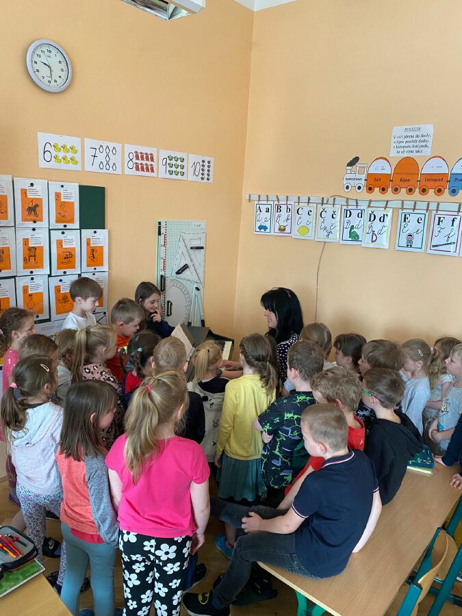 Dne 8.dubna nás v 1. třídě navštívilo 35 předškoláků- budoucích prvňáčků. Žáci jim předvedli, co se už ve škole naučili- četli ze Slabikáře, počítali, skládali slova... Chci pochválit žáky 1. třídy, jak mi pomáhali a věnovali se budoucím prvňáčkům, jak je zapojili a kontrolovali při plnění jednoduchých úkolů. Na závěr jsme si všichni zazpívali a zacvičili. Bylo to super dopoledne.