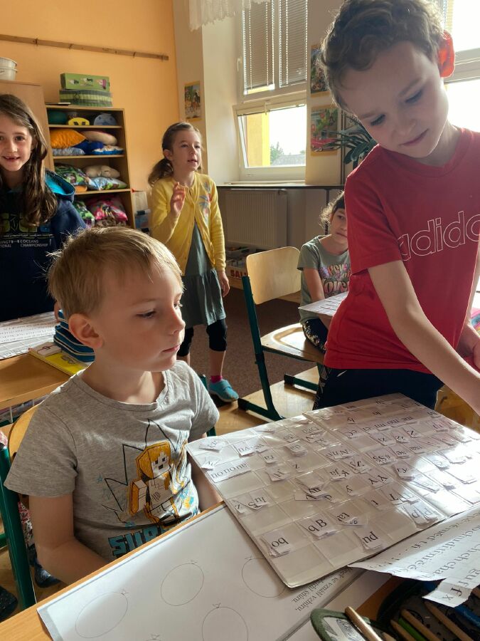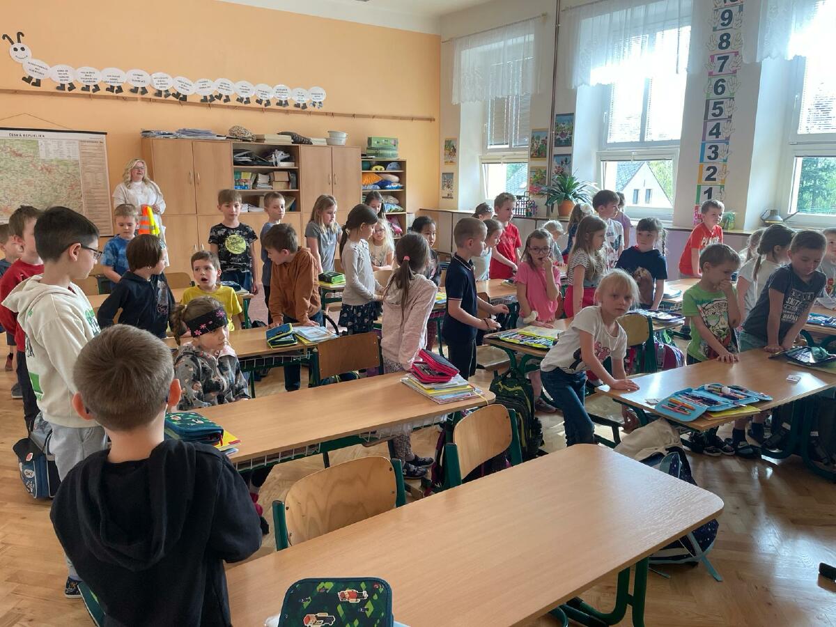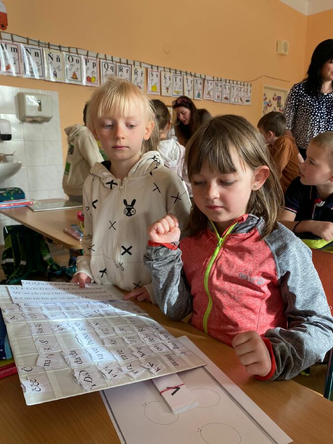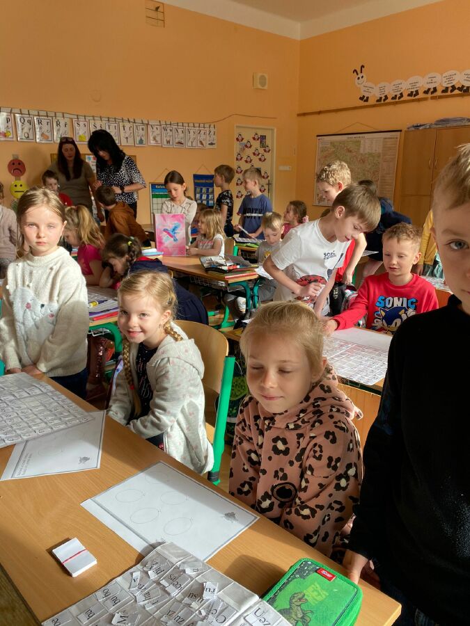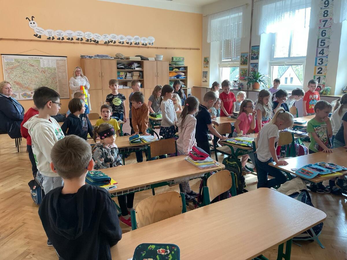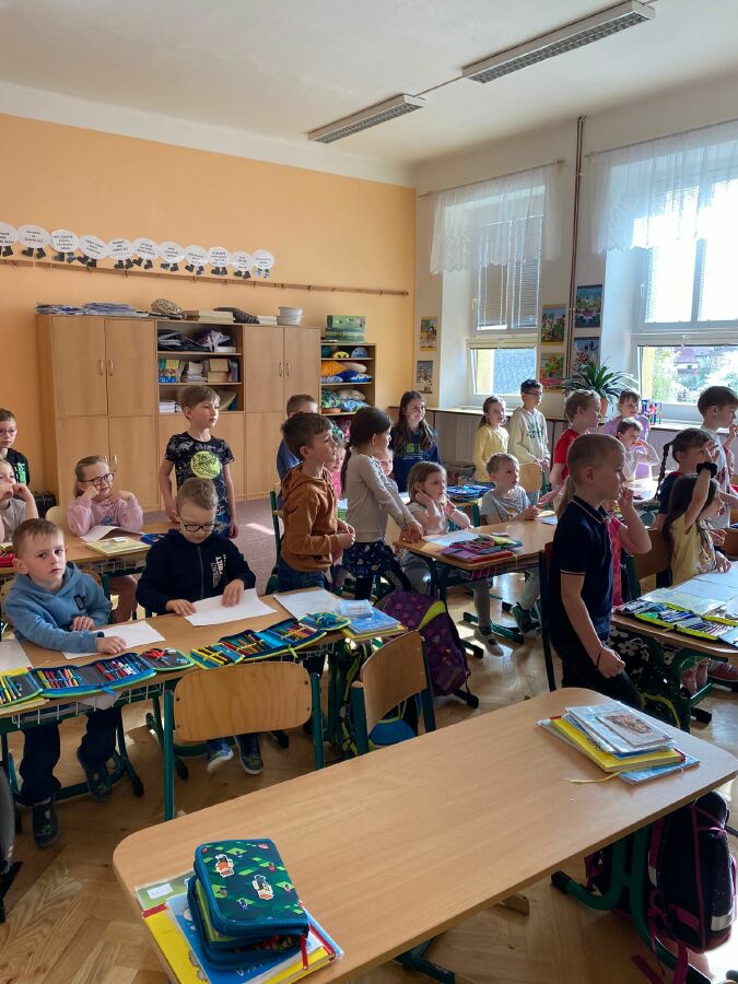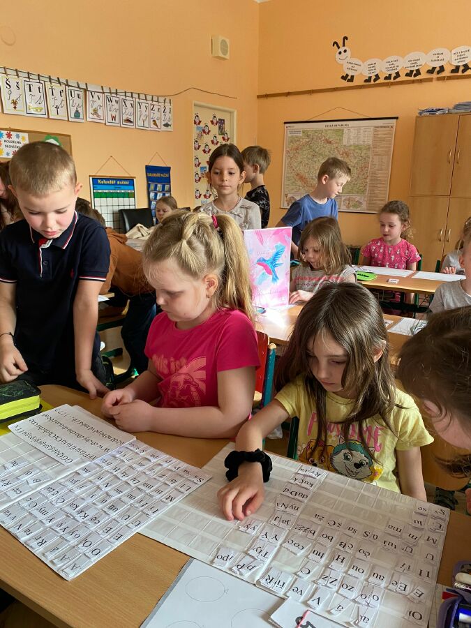 Dne 8.dubna nás v 1. třídě navštívilo 35 předškoláků- budoucích prvňáčků. Žáci jim předvedli, co se už ve škole naučili- četli ze Slabikáře, počítali, skládali slova... Chci pochválit žáky 1. třídy, jak mi pomáhali a věnovali se budoucím prvňáčkům, jak je zapojili a kontrolovali při plnění jednoduchých úkolů. Na závěr jsme si všichni zazpívali a zacvičili. Bylo to super dopoledne.