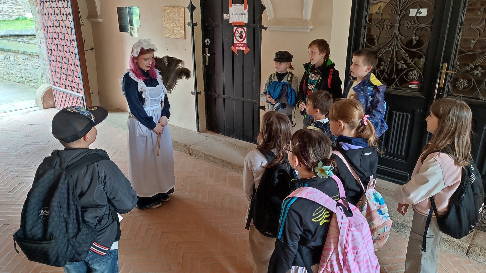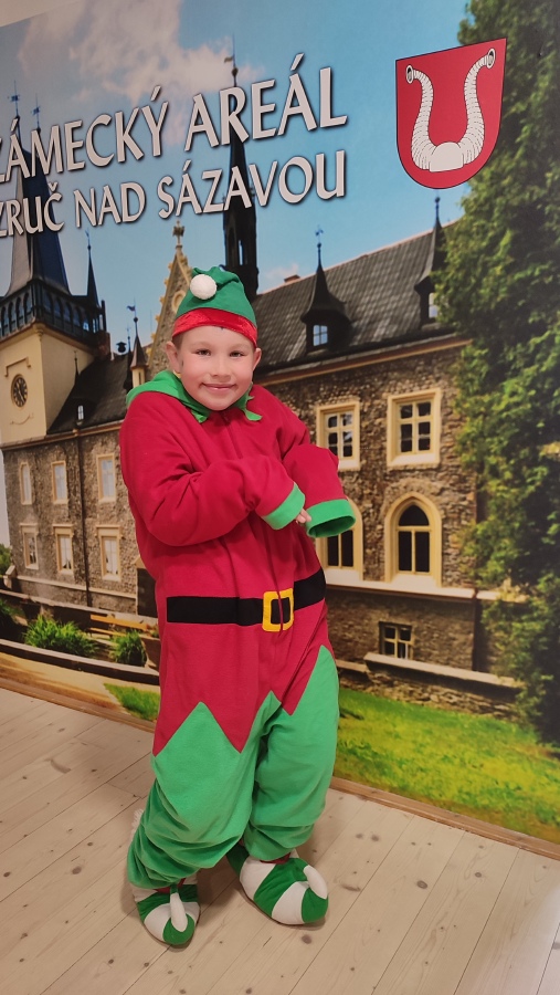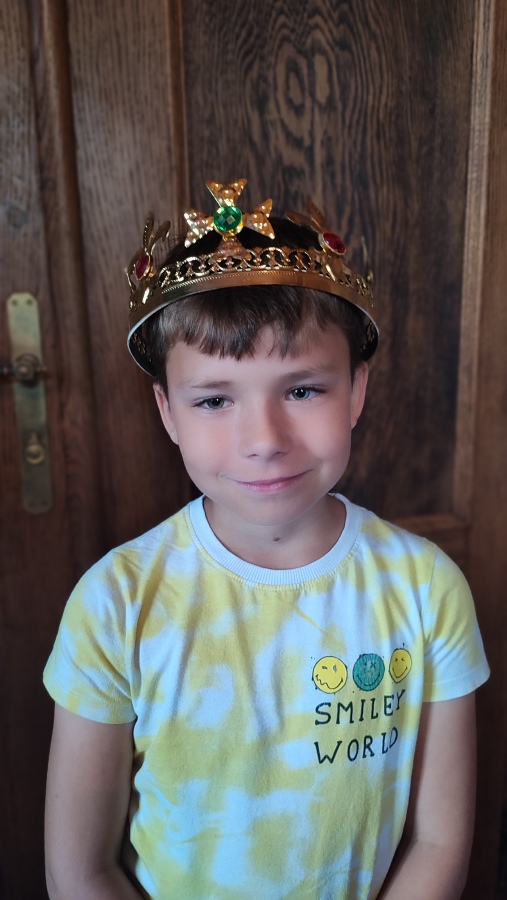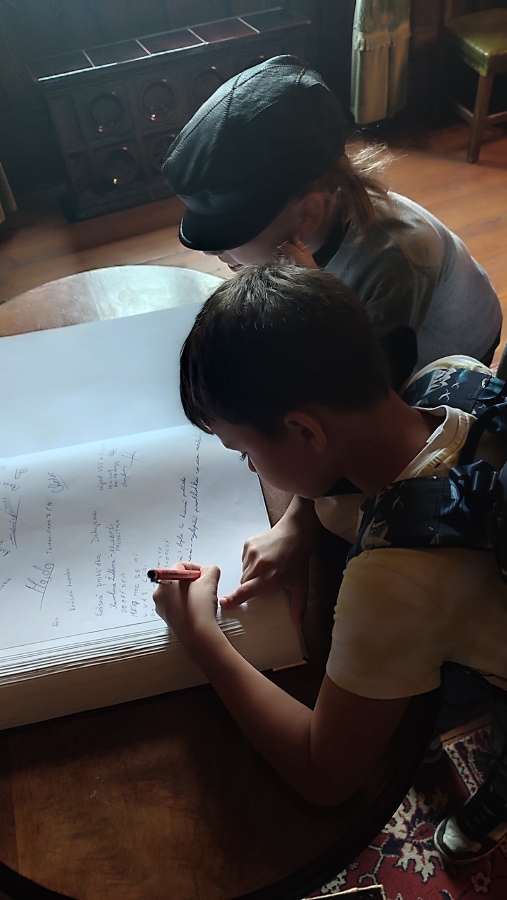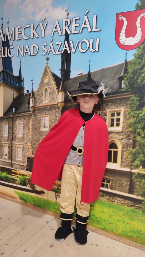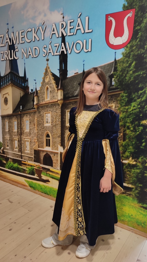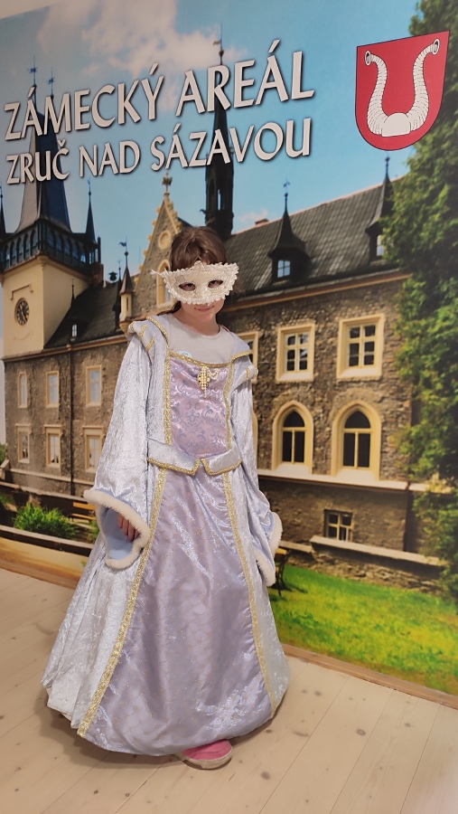 Na zručském zámku na nás čekala komorná Agáta, která nás provedla do všech zámeckých zákoutí. Prohlédli jsme si nádherně prostřenou jídelnu, poslechli orchestrion, podepsali se husím brkem, sestoupili jsme do zámecké koupelny, zatančili si v zrcadlovém sále a v obrovském trezoru v pracovně zámeckého pána jsme objevili zlatou korunu. Po prohlídce jsme se podepsali do knihy návštěv a utíkali jsme do infocentra nakupovat suvenýry.
