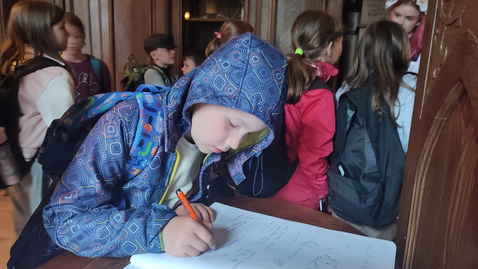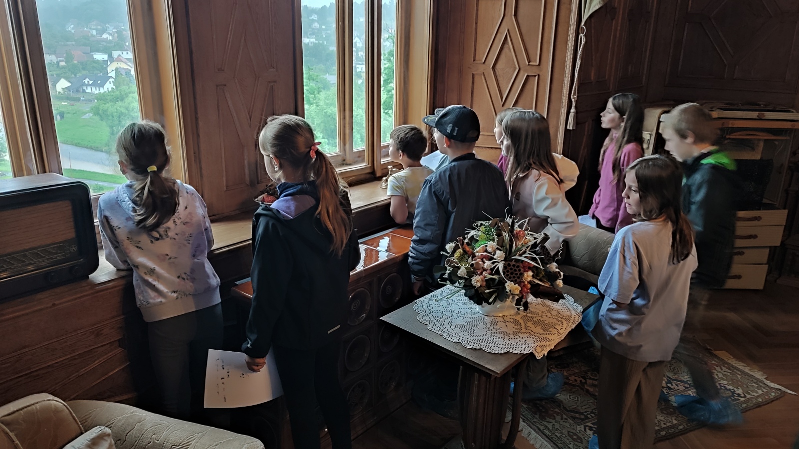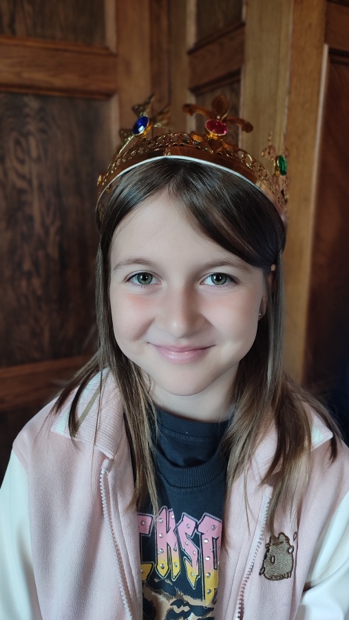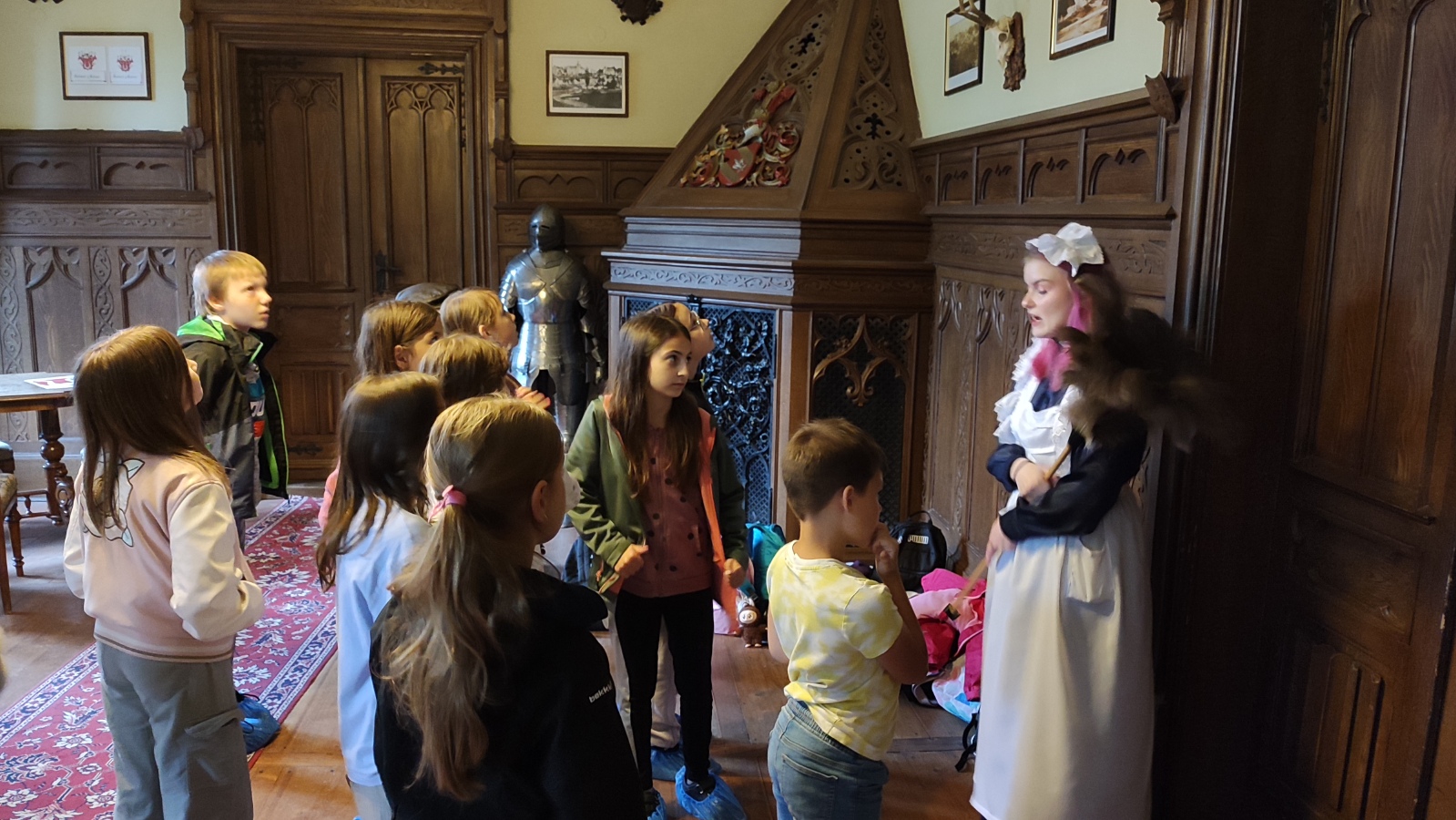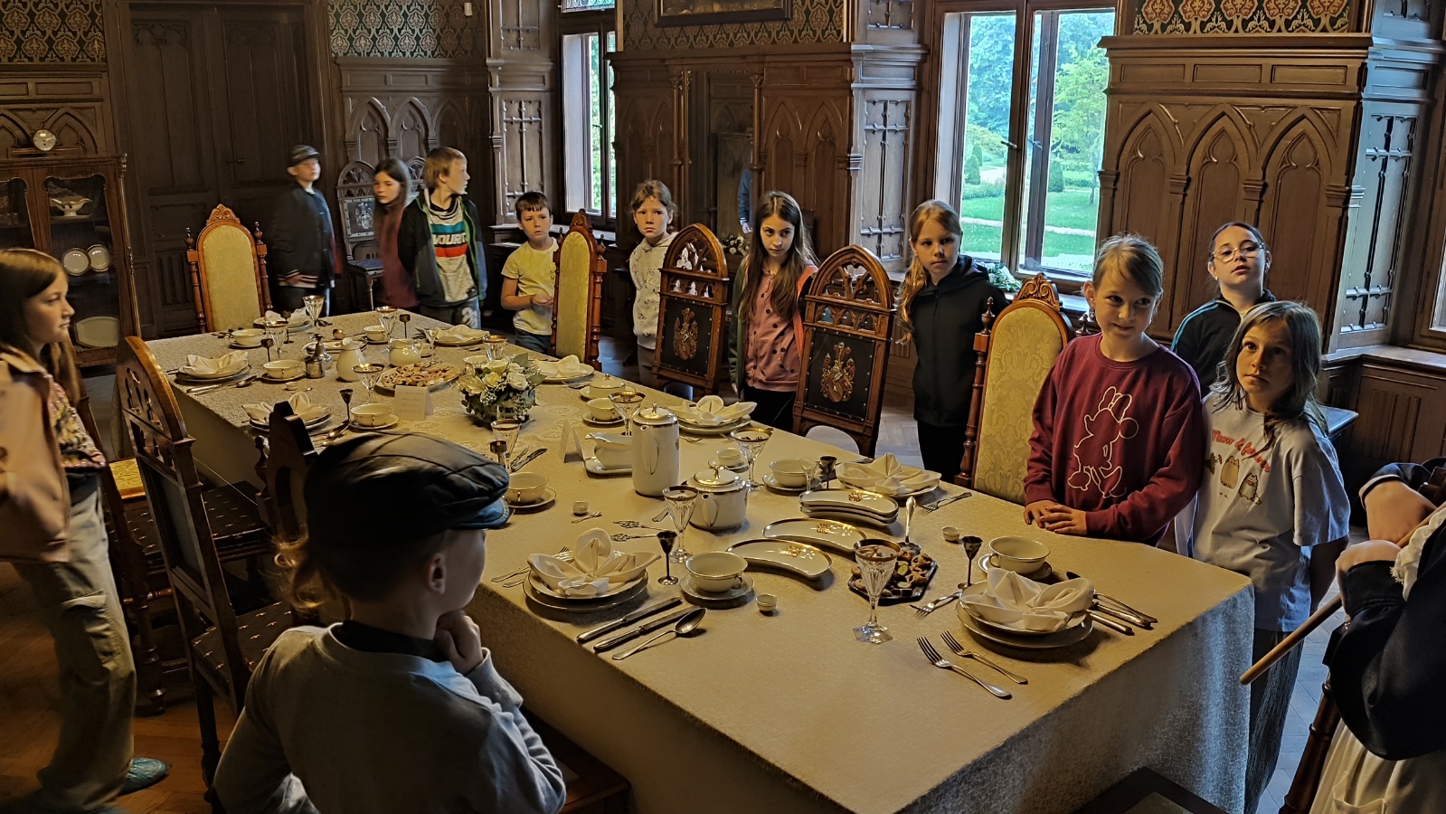 Na zručském zámku na nás čekala komorná Agáta, která nás provedla do všech zámeckých zákoutí. Prohlédli jsme si nádherně prostřenou jídelnu, poslechli orchestrion, podepsali se husím brkem, sestoupili jsme do zámecké koupelny, zatančili si v zrcadlovém sále a v obrovském trezoru v pracovně zámeckého pána jsme objevili zlatou korunu. Po prohlídce jsme se podepsali do knihy návštěv a utíkali jsme do infocentra nakupovat suvenýry.