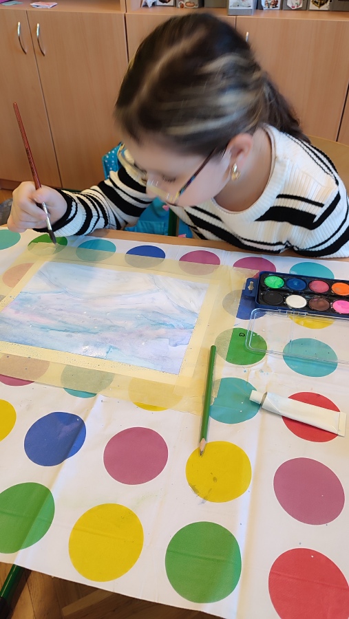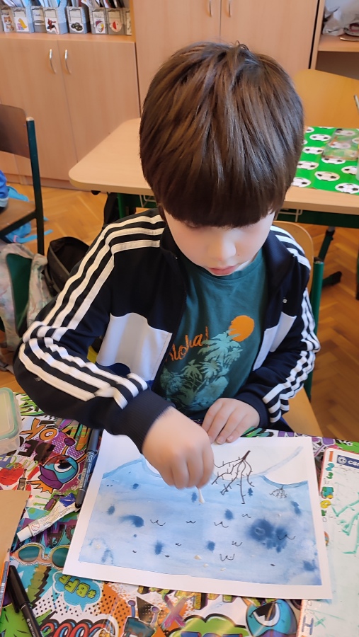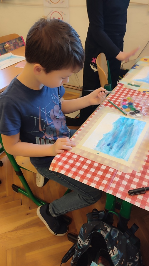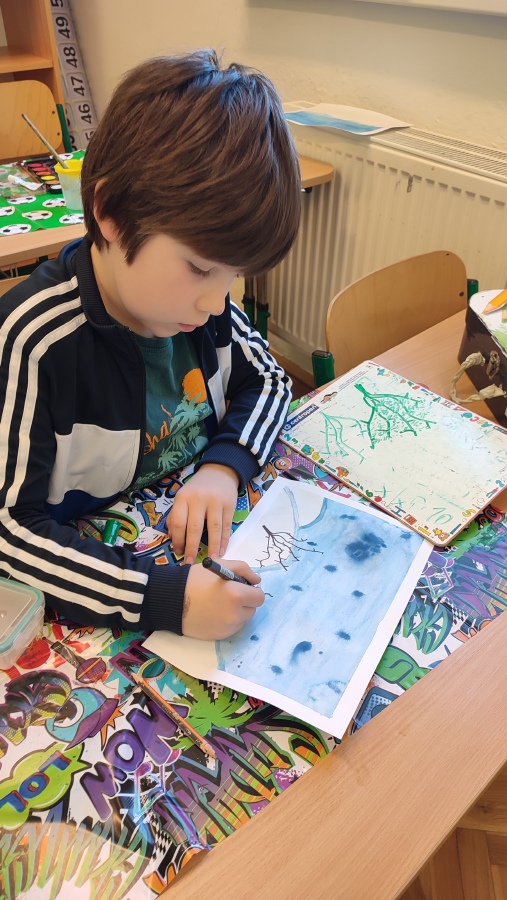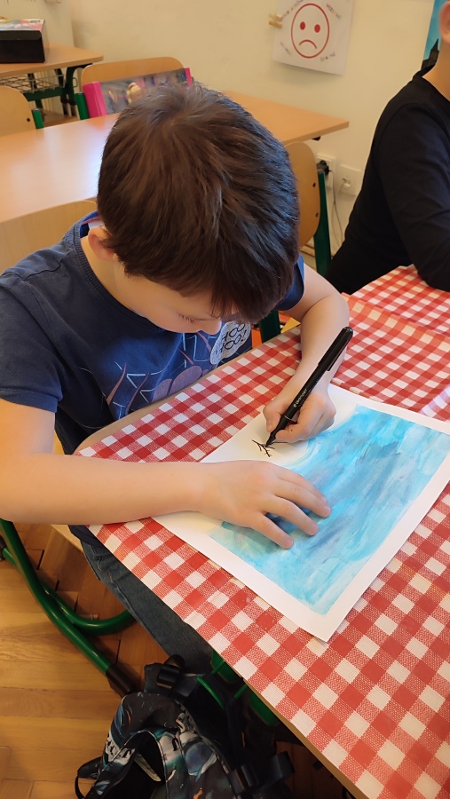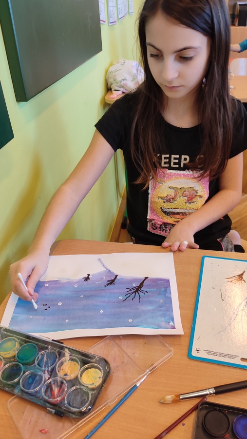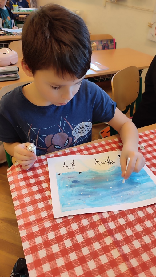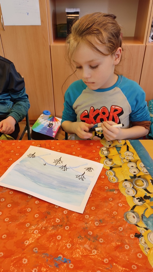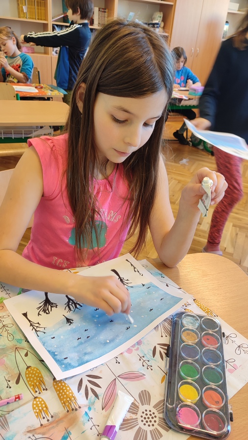 Vyzkoušeli jsme si techniku akvarelu - použití správného množství vody a míchání několika odstínů barev. Tím jsme vytvořili dojem zimní oblohy. V krajině jsme poté kreslili stromy a pokoušeli se o vytvoření perspektivy. Na závěr nechyběla hejna ptáků a sníh, který jsme jednoduše vytvořili pomocí vatových tyčinek.