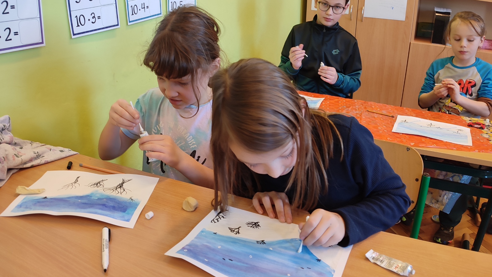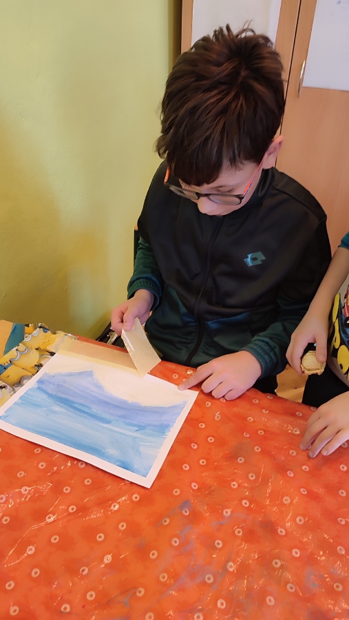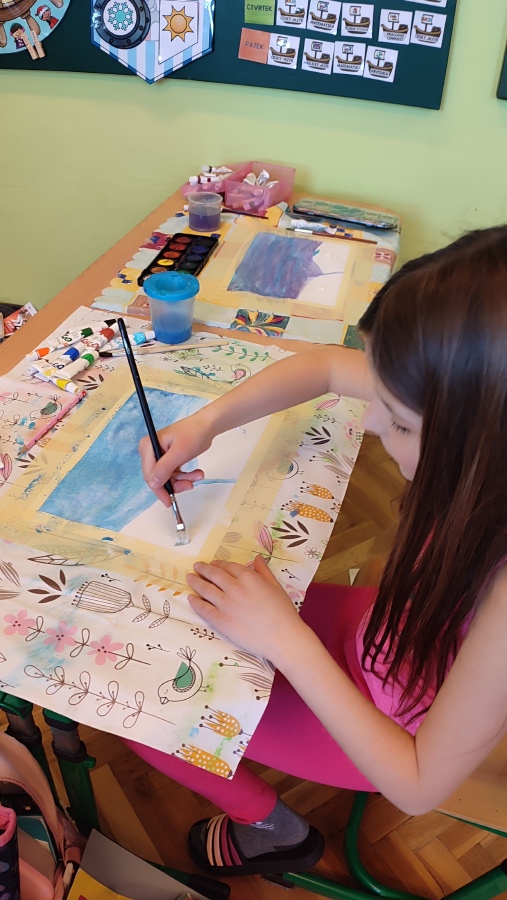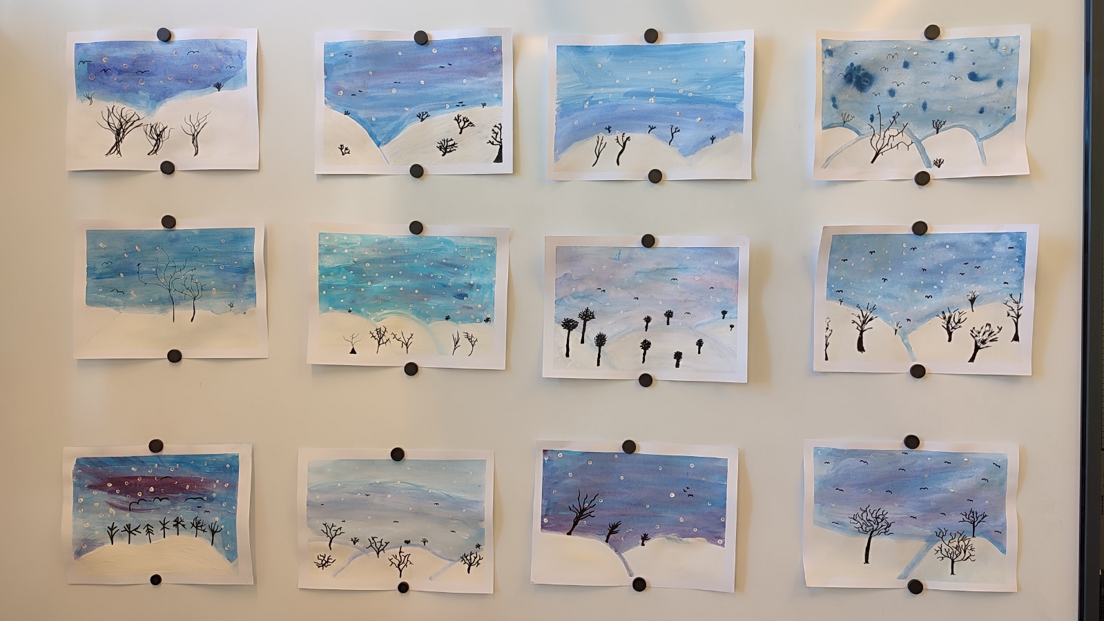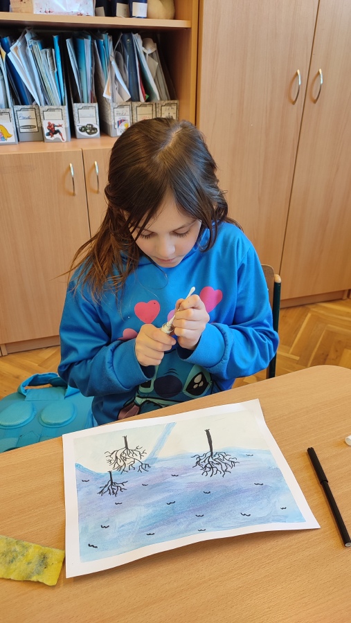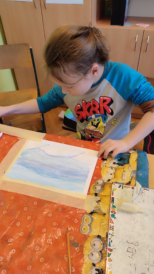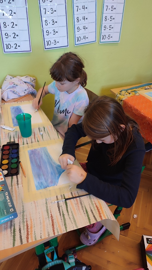 Vyzkoušeli jsme si techniku akvarelu - použití správného množství vody a míchání několika odstínů barev. Tím jsme vytvořili dojem zimní oblohy. V krajině jsme poté kreslili stromy a pokoušeli se o vytvoření perspektivy. Na závěr nechyběla hejna ptáků a sníh, který jsme jednoduše vytvořili pomocí vatových tyčinek.