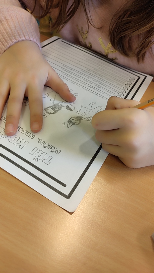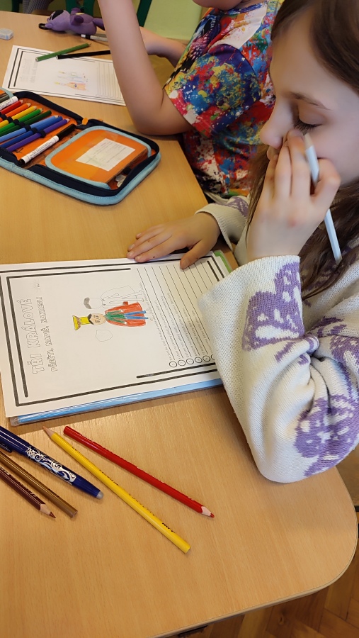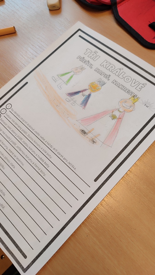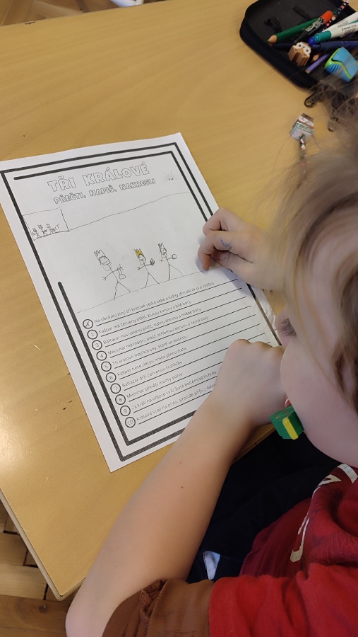 V další hodině českého jazyka jsme se vrátili ke třem králům - v pracovním listě jsme četli s porozuměním, abychom se dozvěděli, kdo vlastně tři králové byli, odkud, kam a s čím šli. Podle textu si každý namaloval obrázek a přepisoval věty podle předlohy.