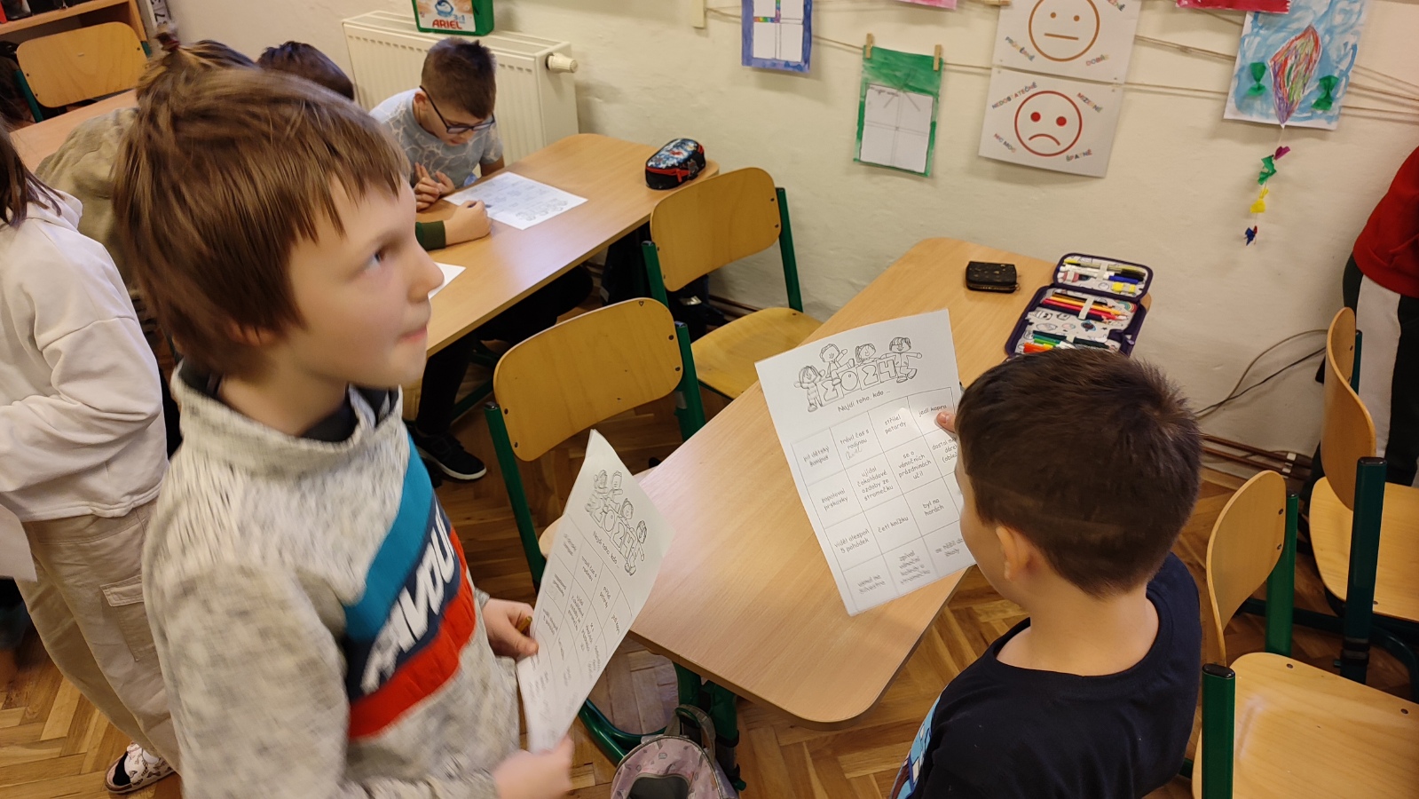 Po koledě jsme si dali na rozehřátí oblíbenou hledací hru, při které se žáci potkávají mezi sebou, vzájemně se vyptávají jeden druhého a hledají odpovědi na otázky, které si zapisují do pracovního listu. Touto formou se nám daří zapojit i naše ukrajinské spolužáky.