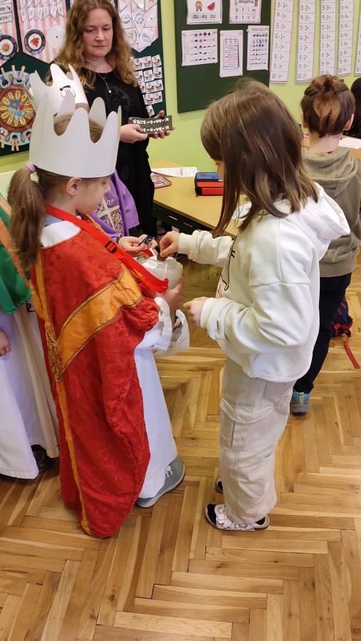 Na začátku hodiny k nám přišla milá návštěva - Tři králové. Zazpívali koledu a my jsme jim rádi přispěli do kasičky na dobročinné účely. A protože je téma obdarovávání a soucitu důležité a potřebné, věnovali jsme se mu v další části dne.