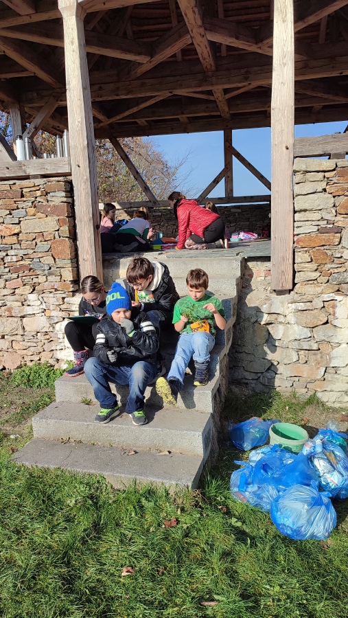 O další přestávce proběhl spontánní úklid okolí a nakonec jsme sesbírali šest pytlů odpadků. Děti byly úplně úžasné. Během společného sdílení už se zamýšlely nad tím, kdo sem také chodí, kdo tu vlastně nepořádek způsobuje a jak by se tomu dalo zabránit. Také si děti samy vymyslely, že by bylo fajn seznámit starší spolužáky s tím, že se tady chceme učit a chceme tu mít pořádek. Proto ve škole uspořádáme malou výstavu fotografií, které naše místečko přiblíží ostatním. A třešničkou na dortu je dopis majitelům, které chce třída poprosit o oficiální svolení, protože víme, že pozemek je soukromý (i když veřejnosti přístupný).