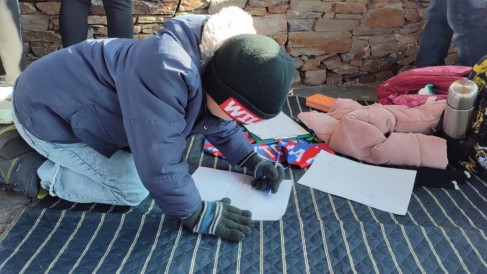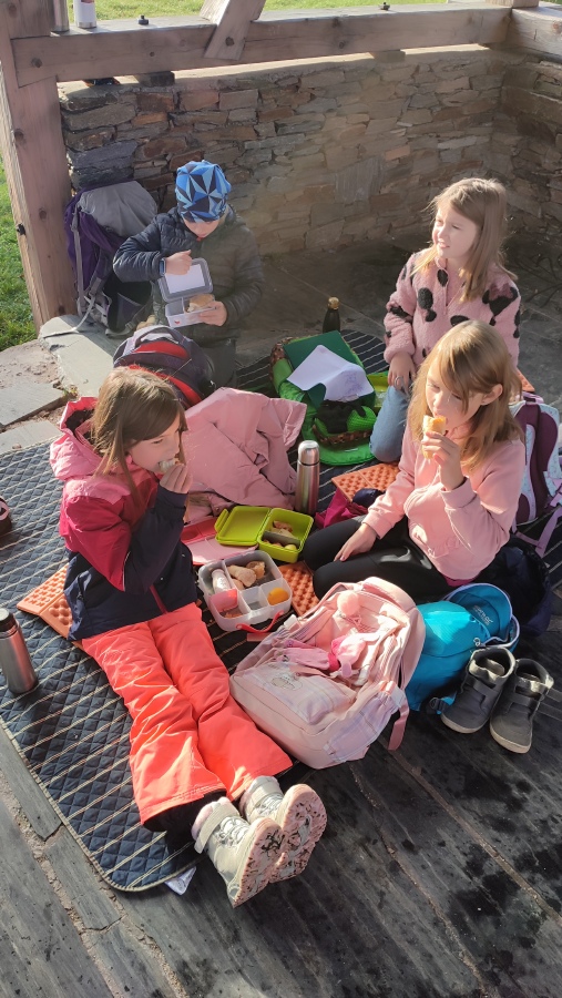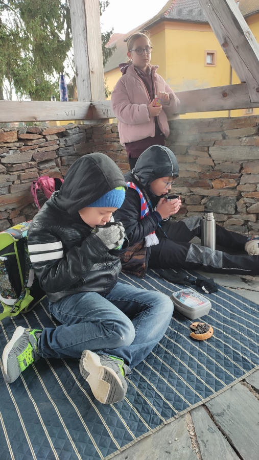 Po příchodu na naše místečko u tvrze následoval piknik a obří svačina. Naštěstí jsme měli velké zásoby teplého čaje, který nás v chladném ránu krásně zahřál. Důkladně posilněni jsme se mohli vrhnout na plnění úkolů v jednotlivých předmětech. V českém jazyce jsme opakovali přídavná jména a jejich opaky, v geometrii jsme opakovali vlastnosti přímky, bodu, způsoby jejich označování a vzájemné polohy. V prvouce jsme se věnovali našemu okolí, zamýšleli jsme se, co máme na našem místě rádi, co všechno bychom se zde mohli učit, co se nám tu naopak nelíbí a co my sami bychom mohli udělat, abychom ho zvelebili.