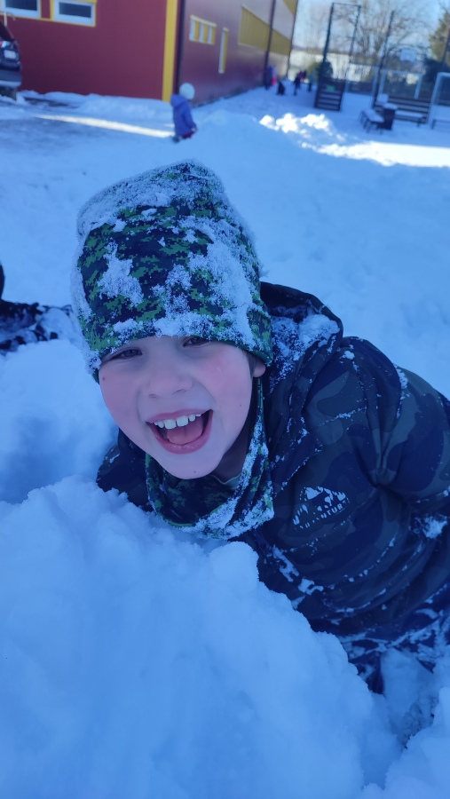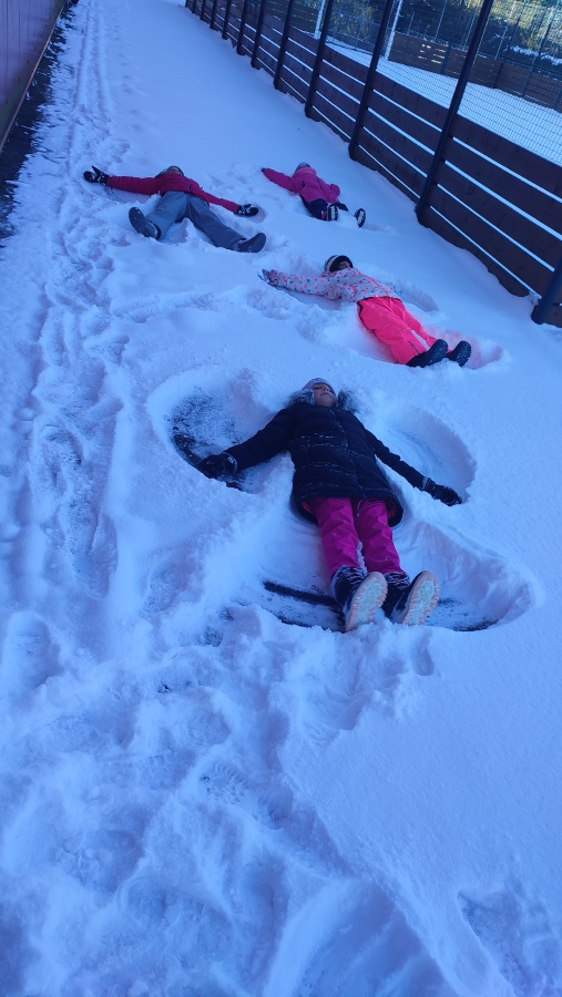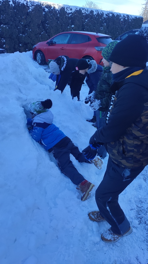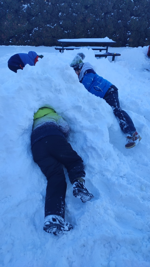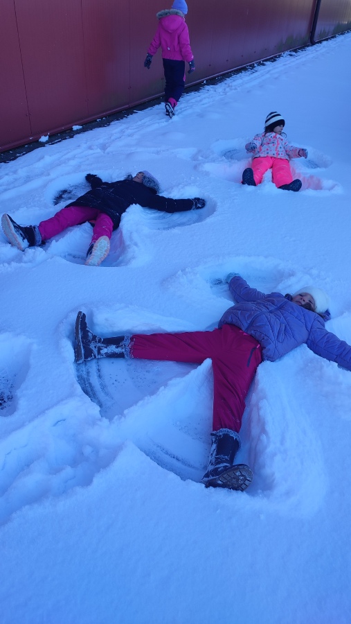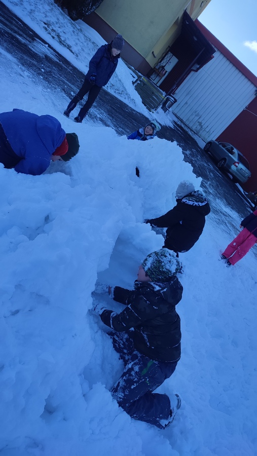 A protože si umíme vzít ponaučení z negativní zkušenosti, v lednu na sněhu už jsme byli připraveni a zima nás nezaskočila. Vyběhli jsme ven na pracovní činnosti a s chutí jsme se pustili do vymýšlení labyrintů a stavby bunkru. Tady bylo velmi důležité umět si rozdělit role, dohodnout se ve skupině, jaký bude postup a jak budou bludiště nebo bunkr vypadat. Několik dětí neodolalo měkkému prašanu a na řadu přišli tradiční sněhoví andělé.