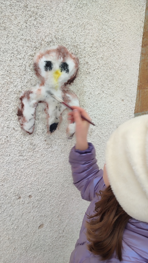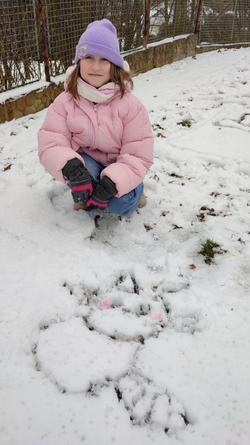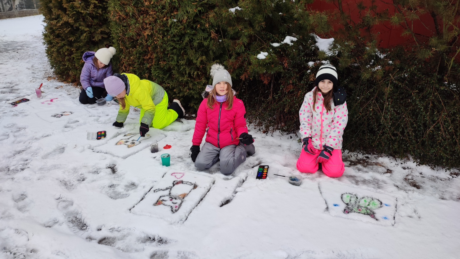 Tématem našeho tvoření byli živočichové. Děti ze začátku trochu pochybovaly, že by šlo na sníh malovat. Za chvíli se jejich obavy rozplynuly a školní zahrada ožila nádhernými výtvory.