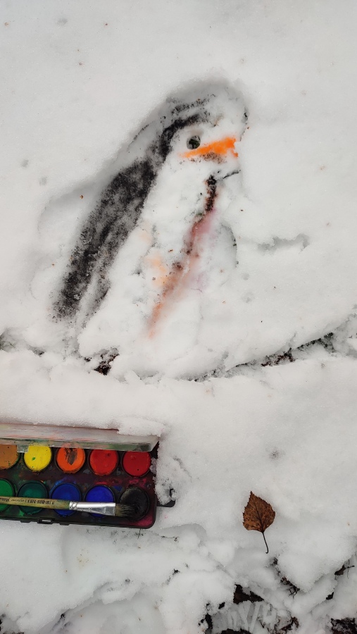 Nejdřív přišel na řadu pokus s rozpouštěním sněhu, abychom měli vodovky v čem namáčet. Pak už si každý našel kousek volného sněhu, vytvořil si na něm malířské plátno a pustil se s chutí do práce. V naší školní galerii se objevili: tučnák, několik koček, rybičky, bílý švýcarský ovčák nebo třeba liška. Bylo fantastické sledovat zaujetí žáků, každý volil jinou techniku, sledovali rozdíly mezi měkkým a tvrdým sněhem, přítlakem na štětec, množstvím použité barvy atd.