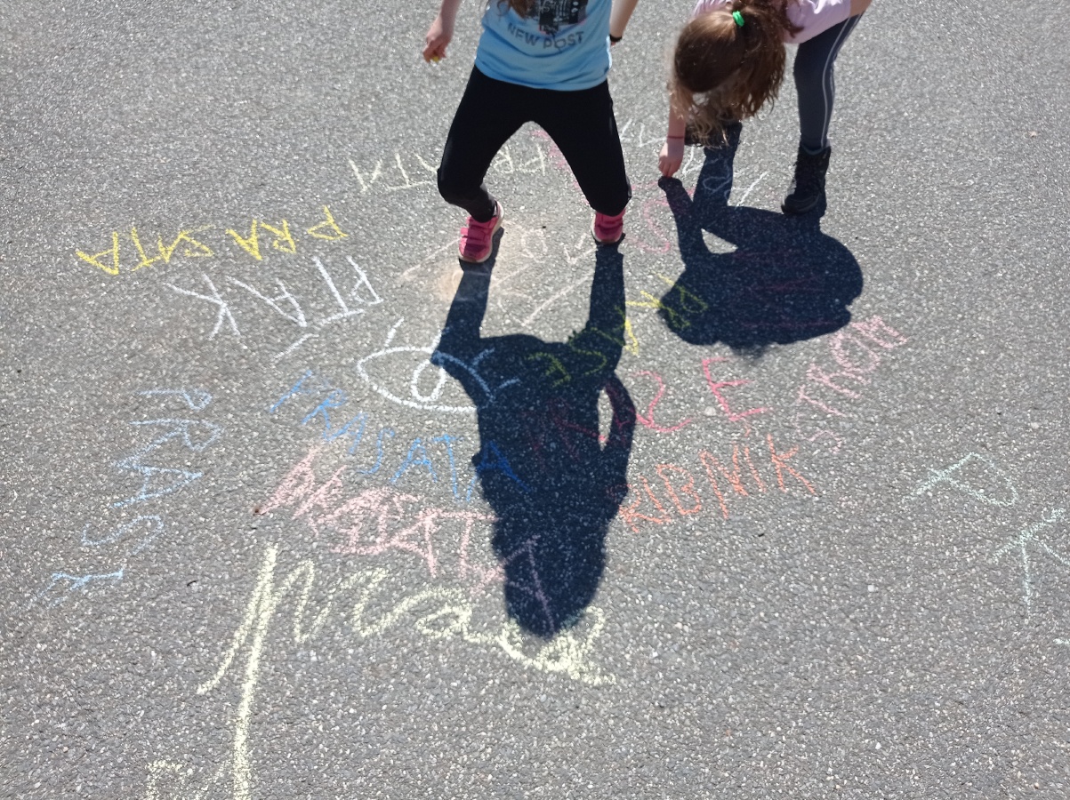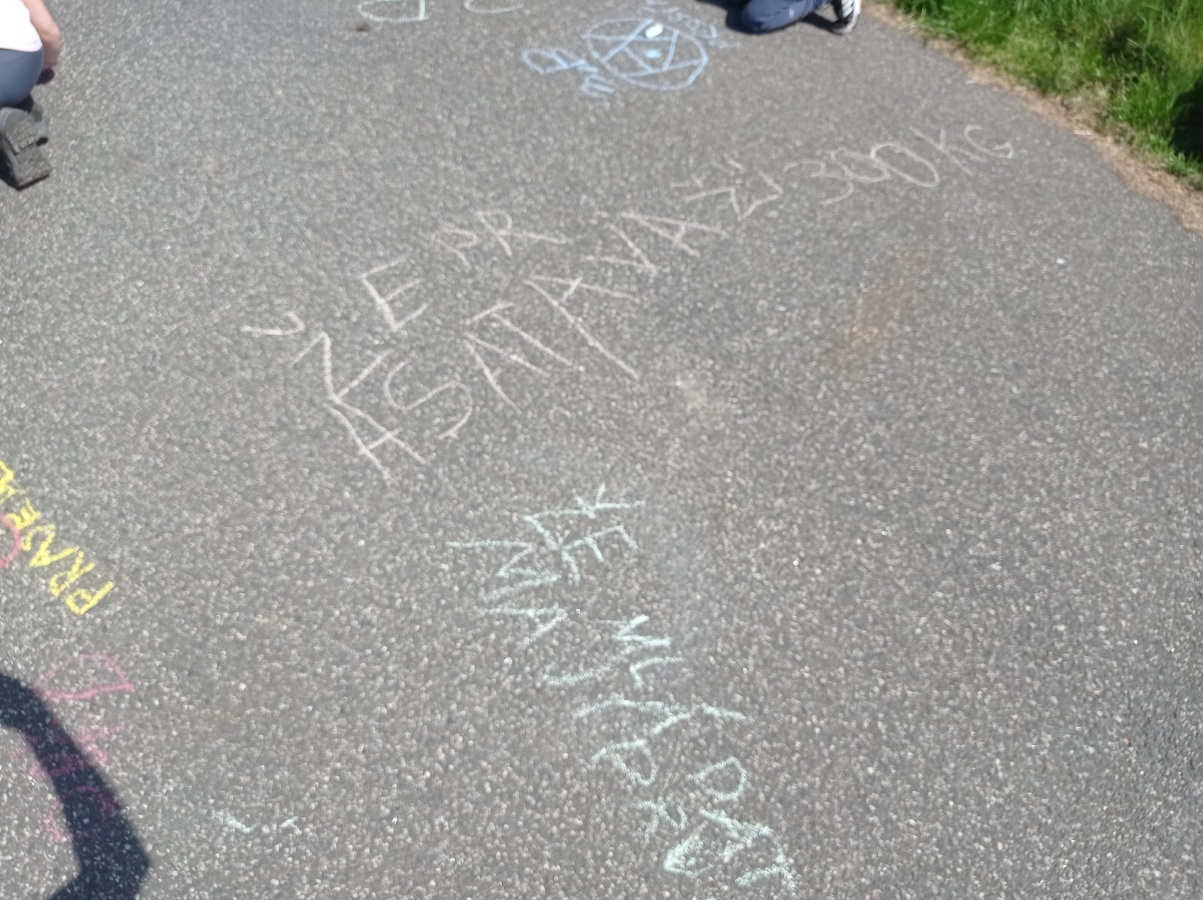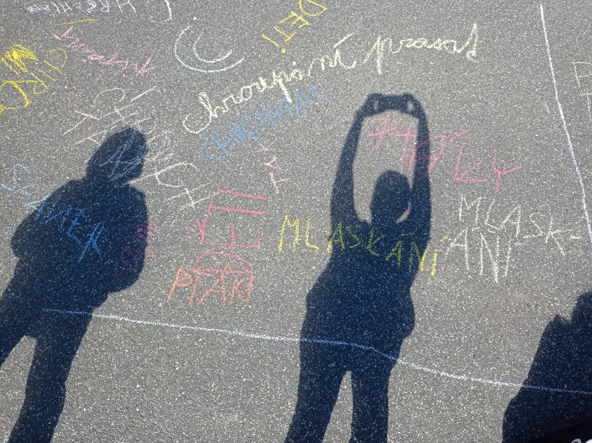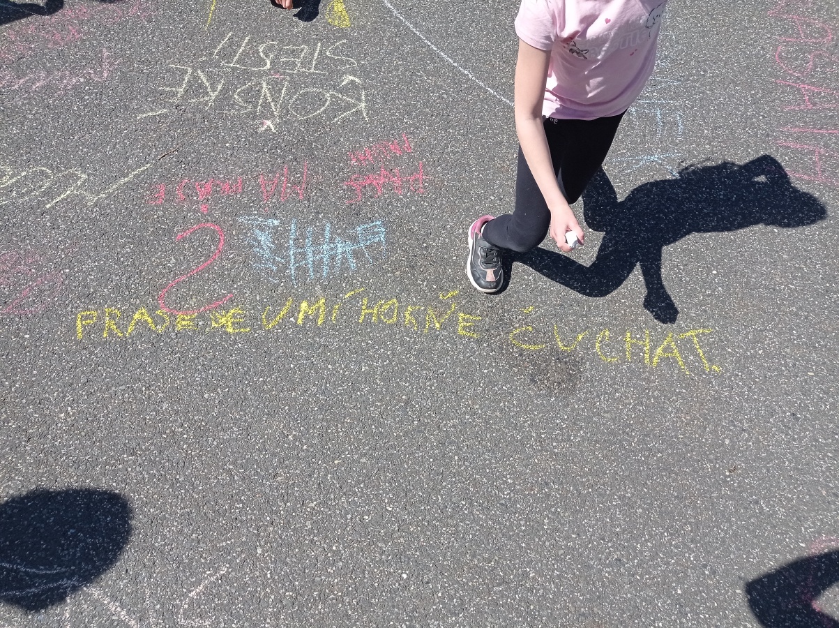 Opět pod komínem jsme výpravu zakončili. Křídou jsme na zem psali, co jsme na výpravě VIDĚLI, SLYŠELI, CÍTILI a CO JSME SI MYSLELI. Za několik dnů naši křídovou stopu smyl déšť..ale vzpomínky nám zůstanou...
