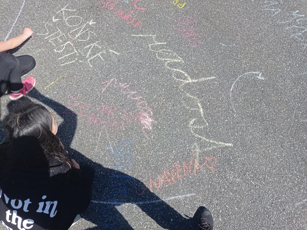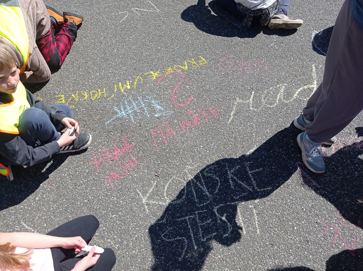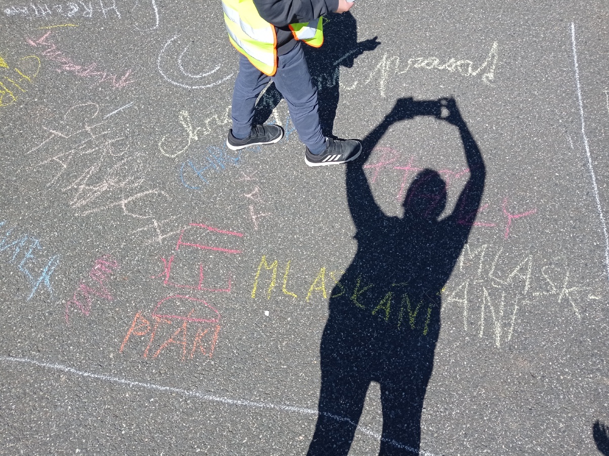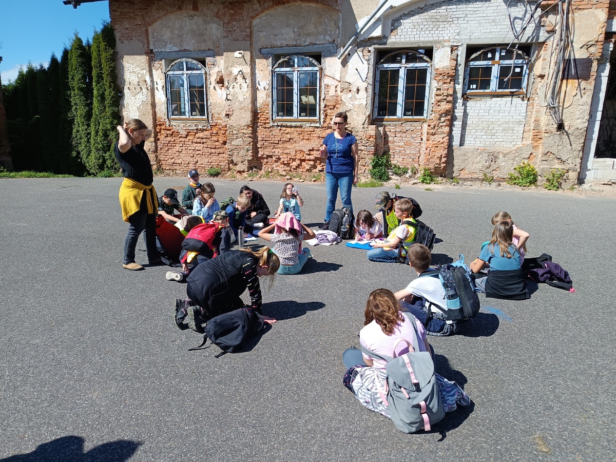 Opět pod komínem jsme výpravu zakončili. Křídou jsme na zem psali, co jsme na výpravě VIDĚLI, SLYŠELI, CÍTILI a CO JSME SI MYSLELI. Za několik dnů naši křídovou stopu smyl déšť..ale vzpomínky nám zůstanou...