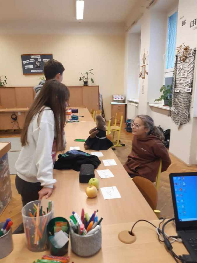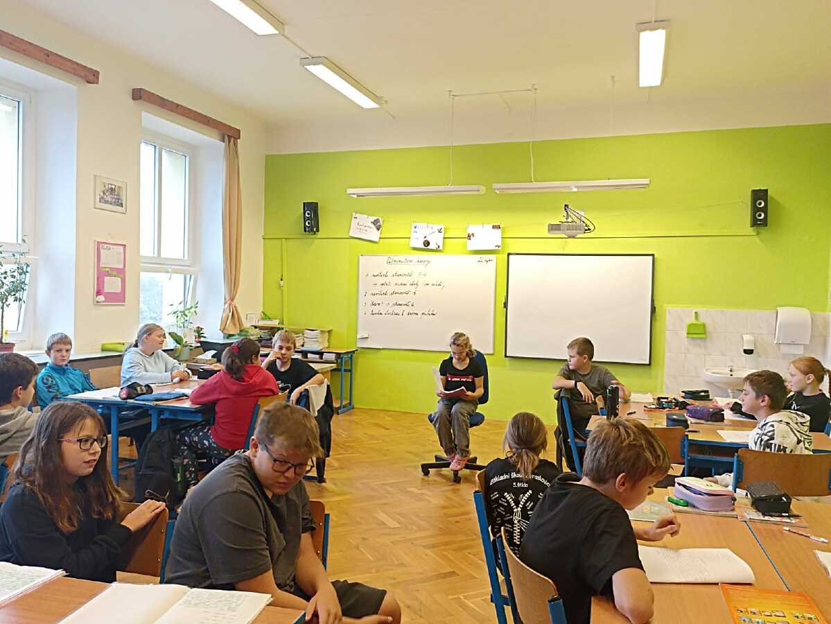 Druhý měsíc uplynul jako voda. Dvě besedy, slunečný branný den, výuka v lese a pár střípků z hodin češtiny a angličtiny.